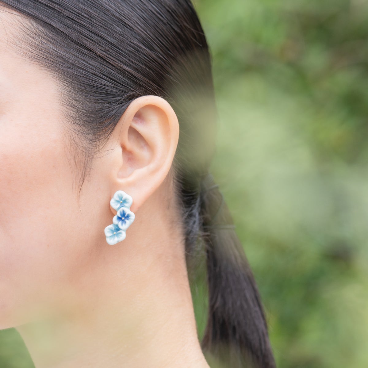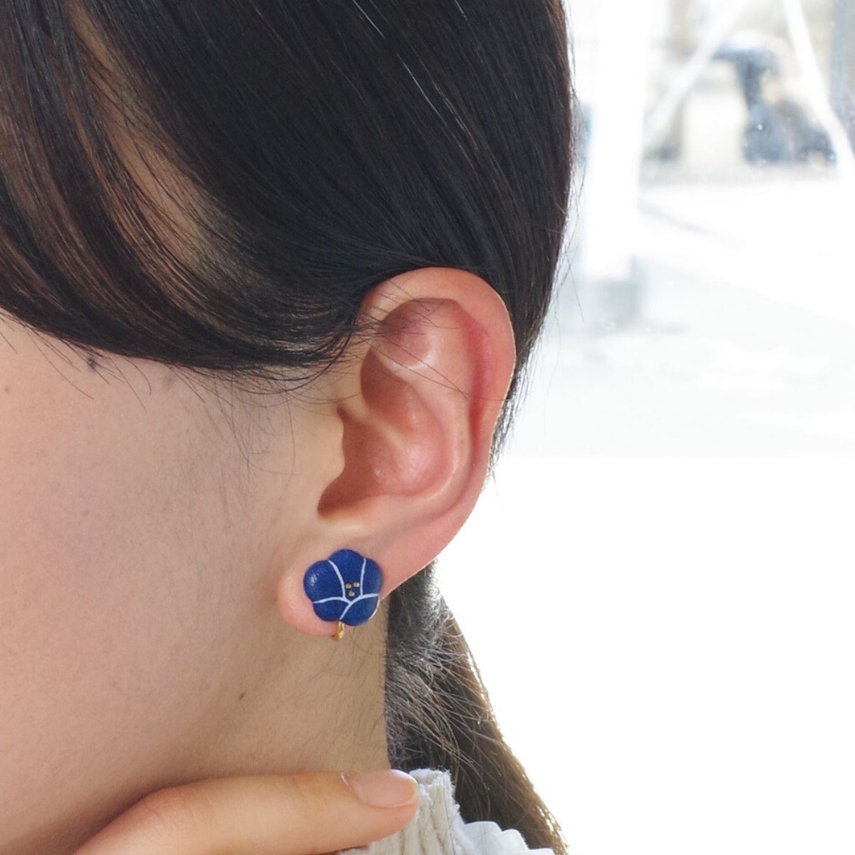 ころんとした丸みのあるフォルムで咲く、凛とした梅の花。柔らかさをまといながら、青と白のコントラストですっきりとした品の良さを演出。シンプルな装いにぴったりです。