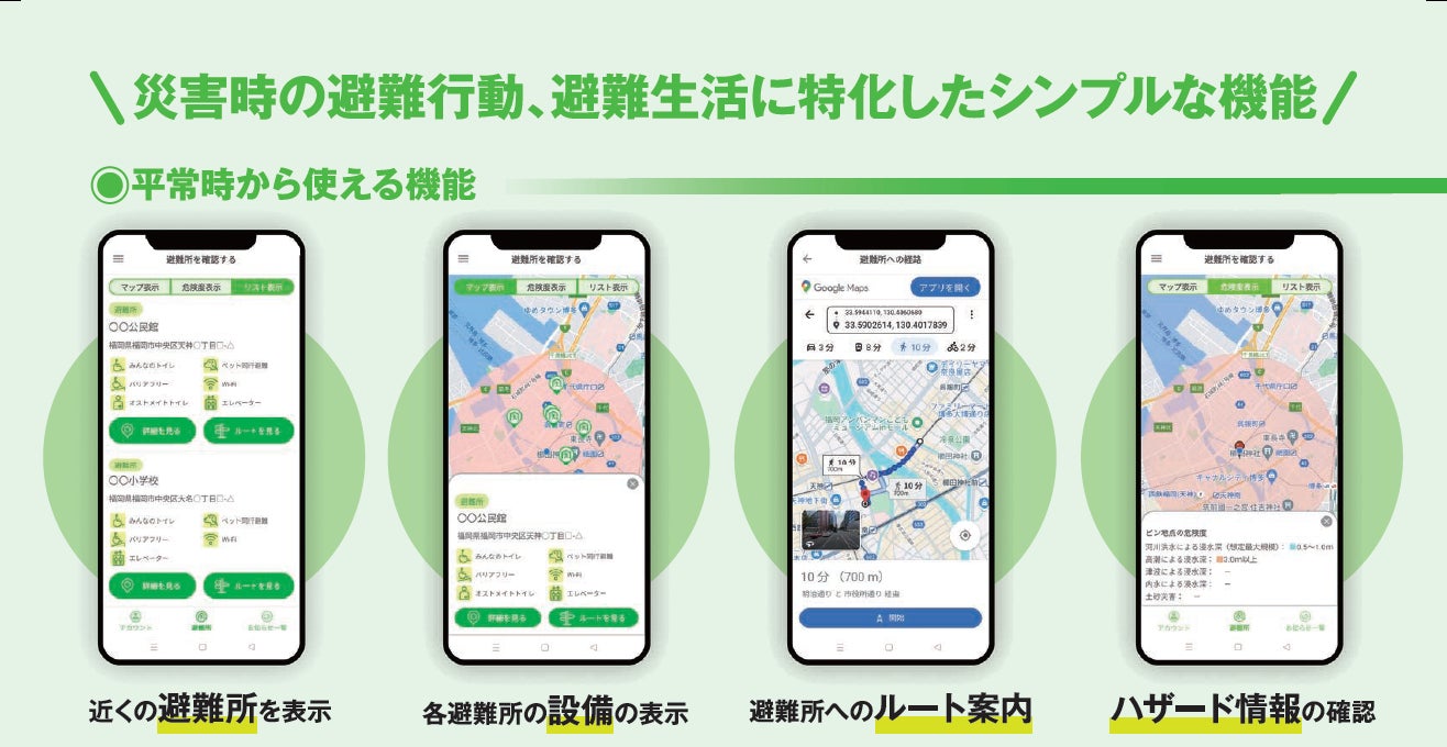 近くの避難所の位置や設備を一覧・地図で表示するほか、避難所へのルートを確認できます。