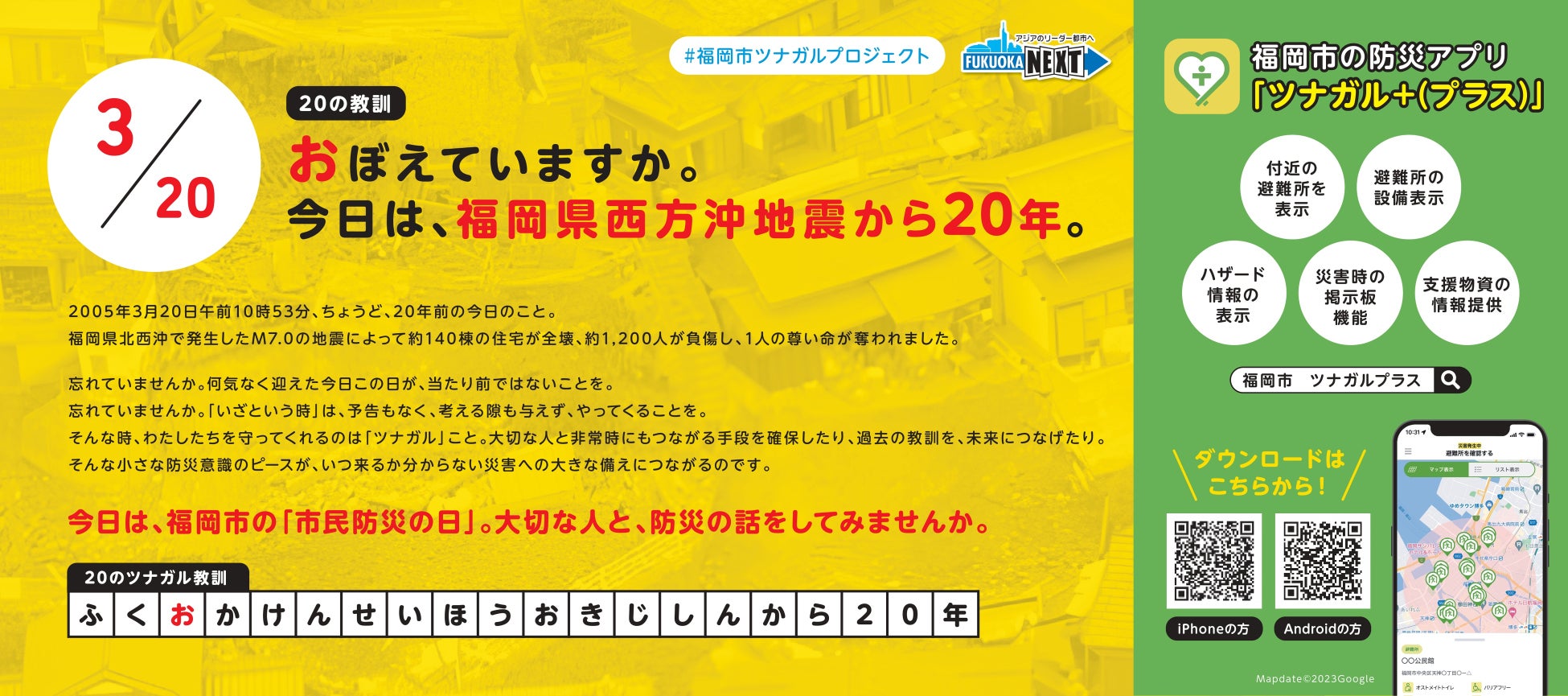 3月1日(土)より各所で広告を展開していた福岡市の防災アプリ「ツナガル+(プラス)」。福岡県西方沖地震から20年の節目となる今日、「20のツナガル教訓」の答えが公開されました。