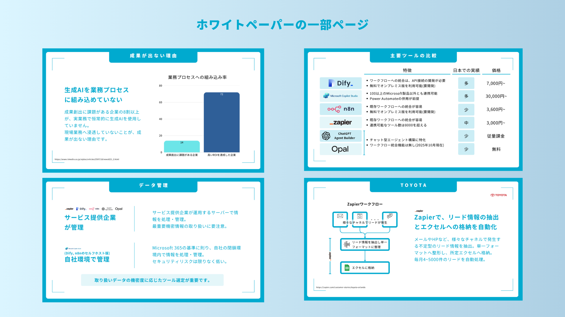 本ホワイトペーパーでは、「成果の出ないAI」の罠から抜け出し、ROIを最大化するための具体的な手法として「AIワークフロー自動化ツール」を徹底解説しています。