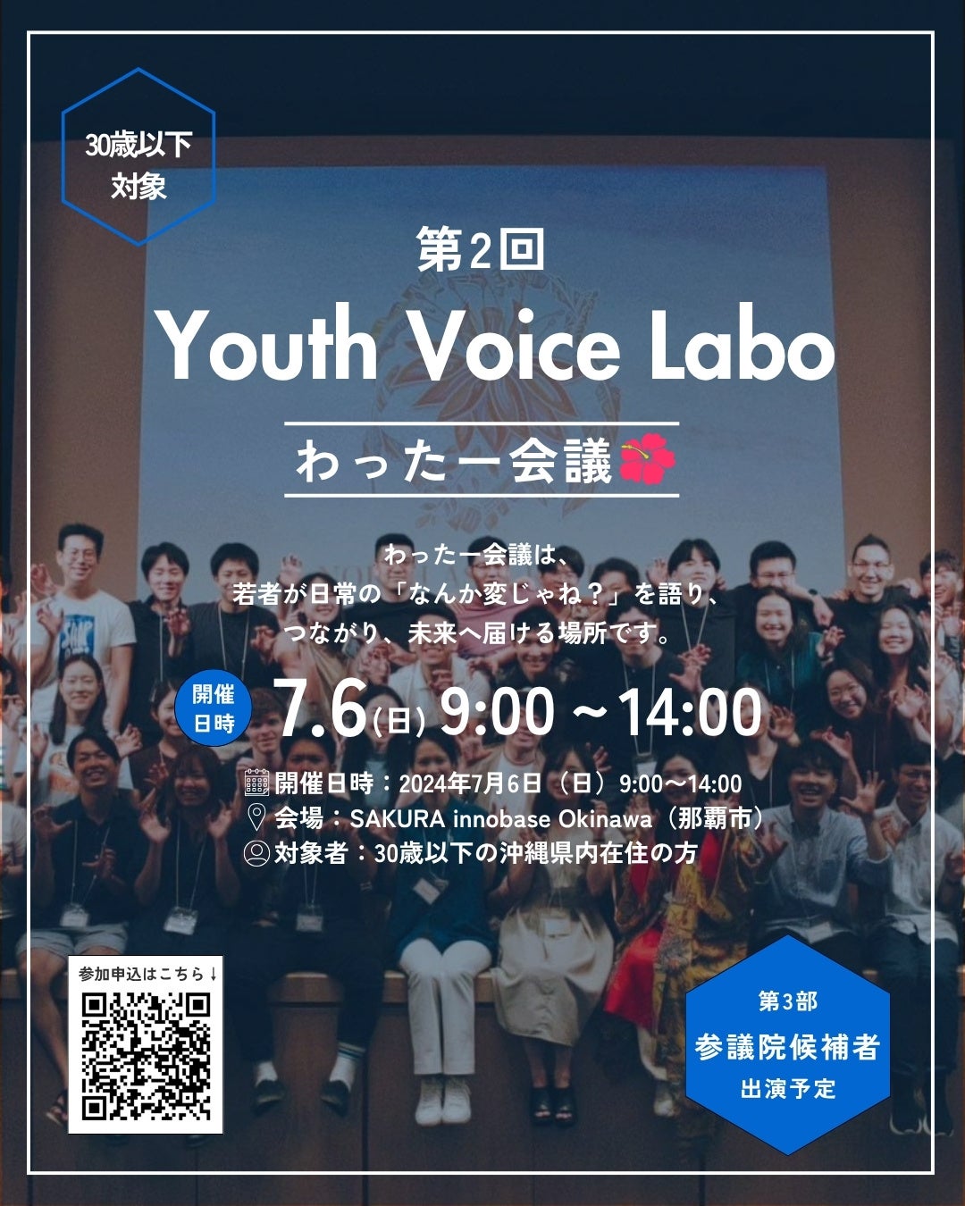 Global Shapers Community Okinawa(以下、GSC沖縄)は、若者世代が社会や政治との接点を持ち、自分ごととして未来を描く共創型イベント『第2回 Youth Voice Labo@わったー会議』を、2025年7月6日(日)にSAKURA innobase Okinawa(那覇市)にて開催いたします。