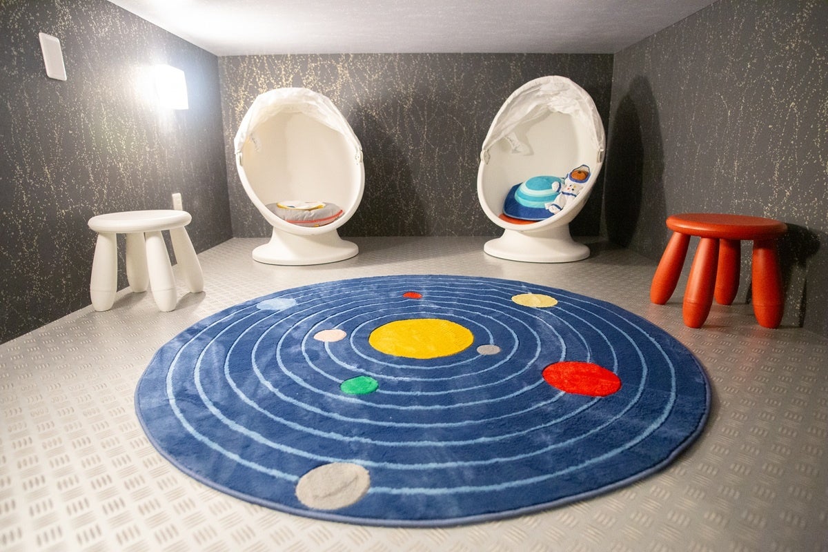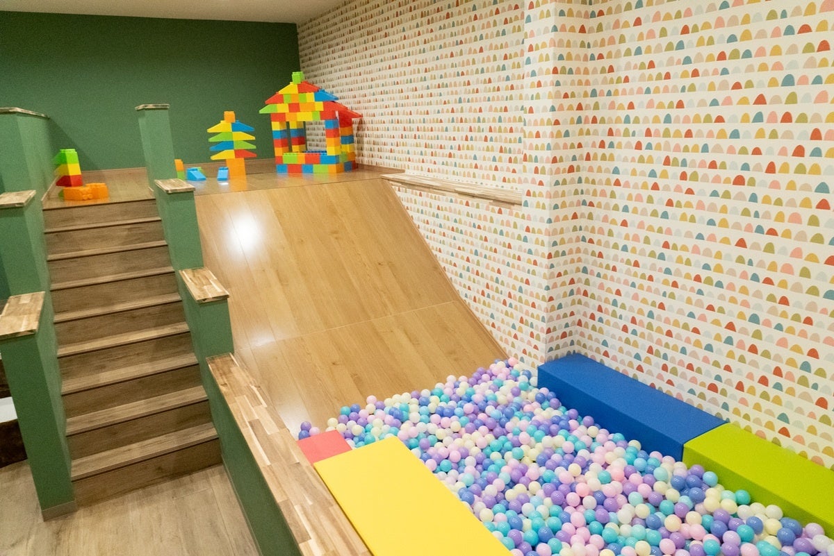 1階全体がお子さま向けのプレイエリアになっています。滑り台・ボールプール・トランポリンなどの遊具を設置し、子どもたちは安全かつ自由に遊べるエリアです。お天気を気にせず、一日中楽しく遊べます。