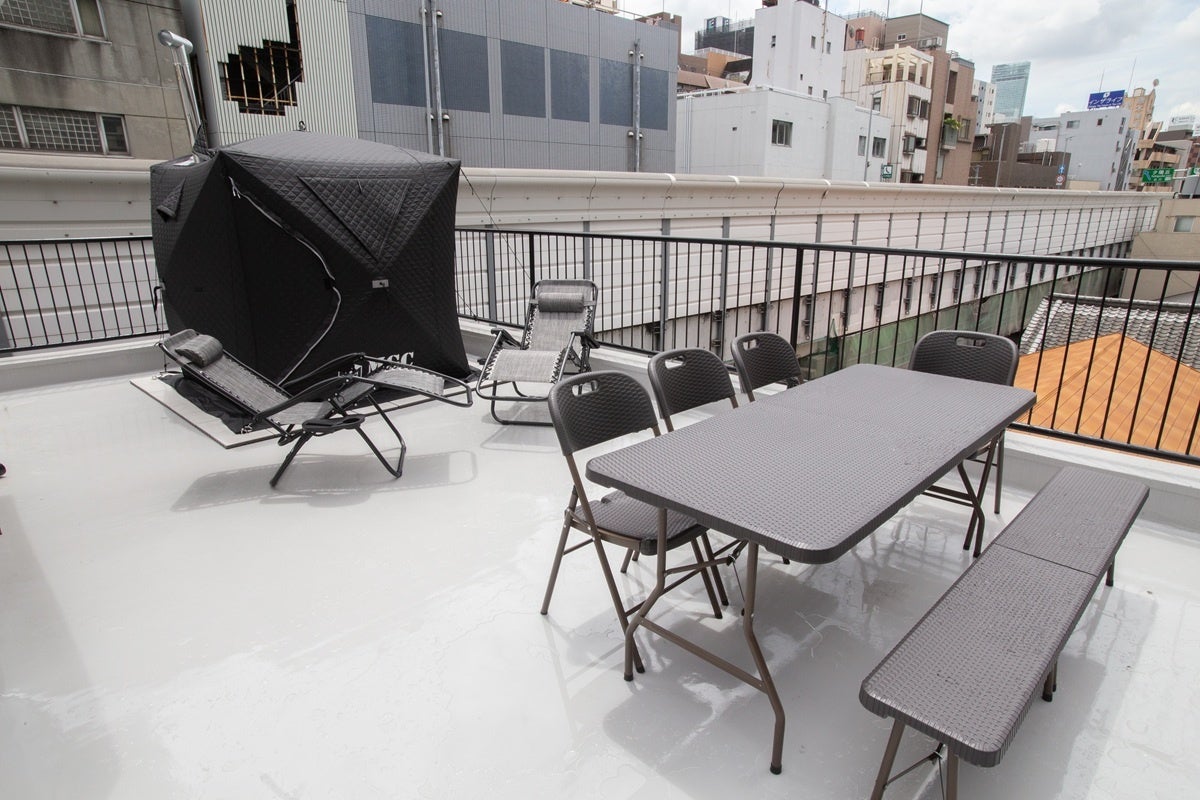 屋上には解放感あふれるテントサウナを設置。大阪ミナミの空を眺めながら、非日常の癒し時間を提供します。BBQセットも設置しており、都会の真ん中で家族やグループでのアウトドア気分を満喫できます。