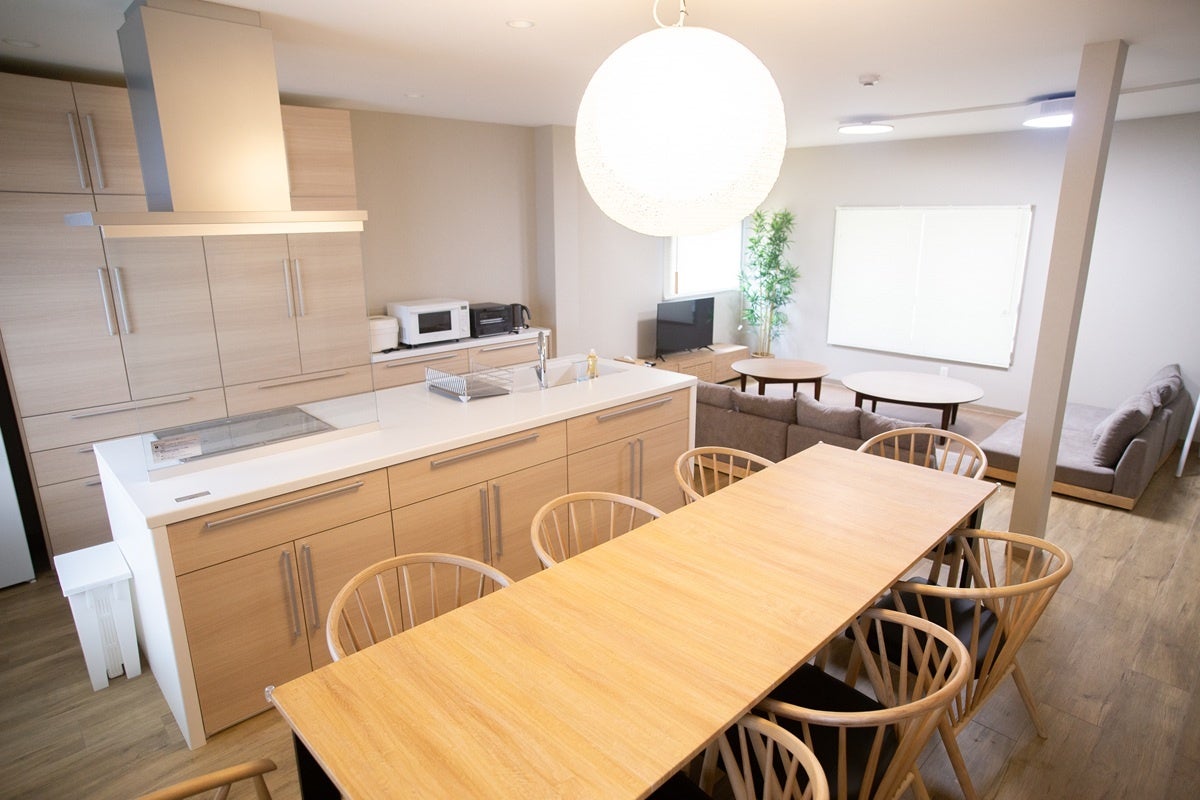 3階のIH付きのキッチンでは、黒門市場で手に入れた新鮮な食材を使った「インドアクッキング」も楽しめます。キッチンに隣接するリビングルームには大型プロジェクター(popIn Aladdin)を設置。家族や友人同士でゆったり映画を楽しむなど、旅の思い出を深めることができます。
