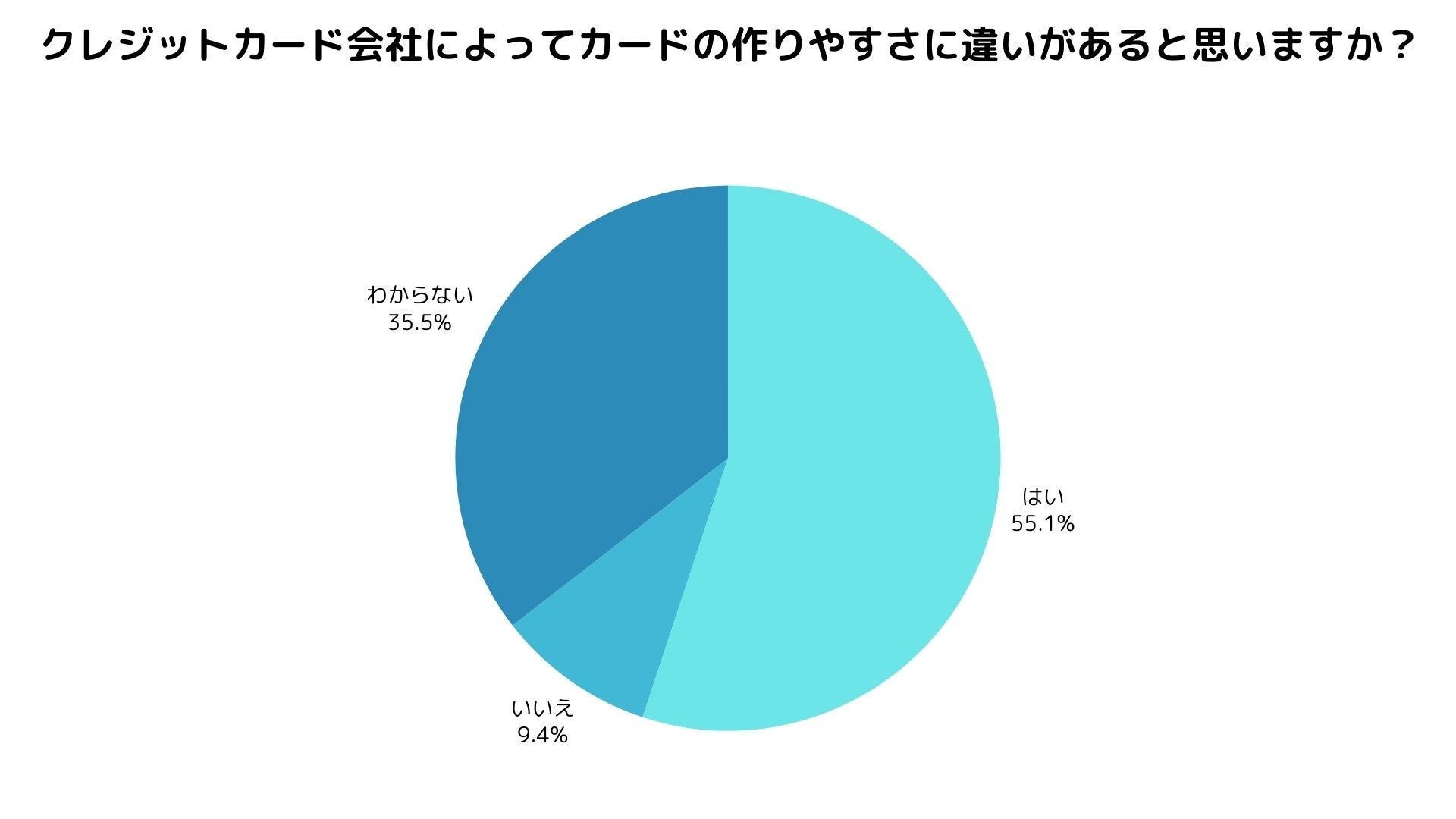 「カード会社ごとに通りやすさに違いがあると思いますか?」という設問には、55.1%が「あると思う」と回答。「わからない」は35.5%、「ないと思う」は9.4%でした。