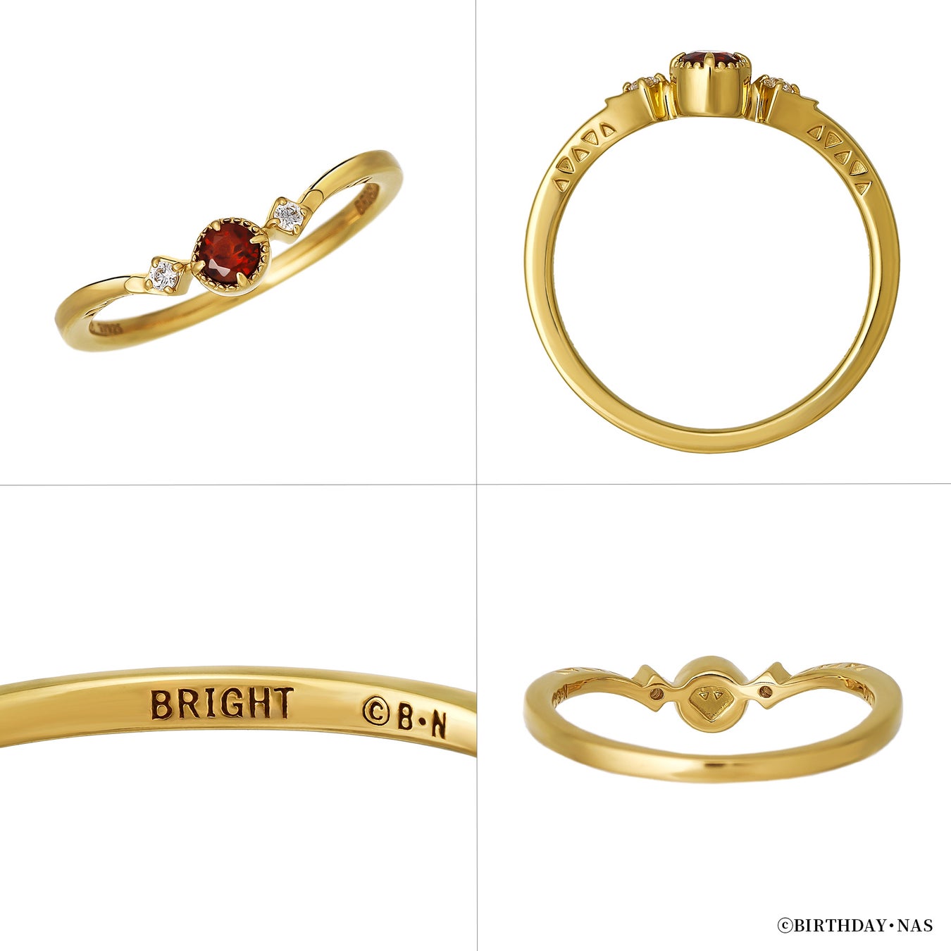 容姿端麗でみんなの憧れの的であるブライトを、しなやかな曲線のアームときらめくミルグレインで表現し、石座の裏には「宝石の国」のマークを刻みました。瞳やマントの色を思わせる真っ赤なガーネットと、白い服を表現したクリアのカラーストーンがきらめきます。アームの側面にデザインされた服の柄や、内面の“BRIGHT”の刻印もさりげないポイントです。