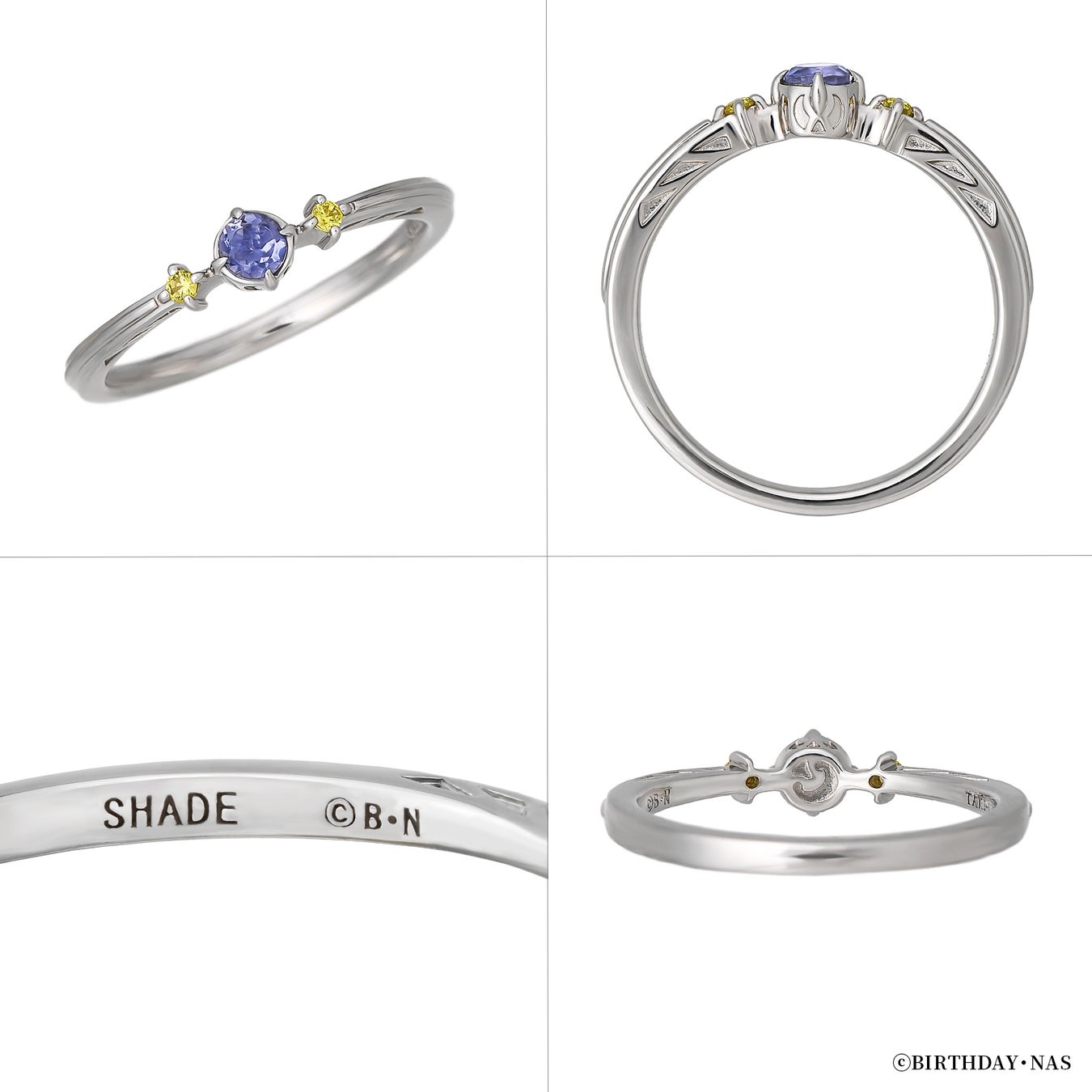 大人びていてクールなシェイドを、すっきりとしたストレートのアームとシャープな爪留めで表現し、石座の裏には「月の国」のマークを刻みました。瞳や髪の色を思わせる青紫のアイオライトと、黄色い服を表現したカラーストーンがきらめきます。石座とアームの側面にデザインされた服の柄や、内面の“SHADE”の刻印もさりげないポイントです。