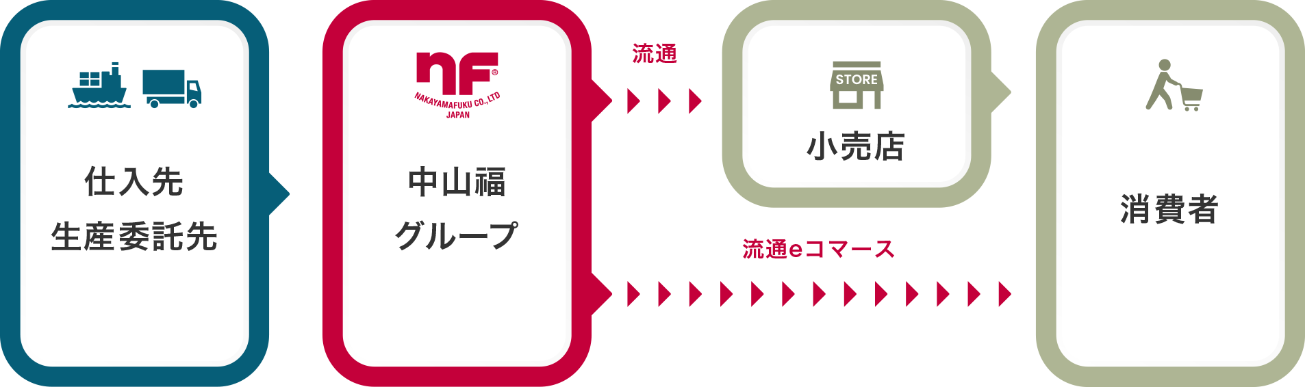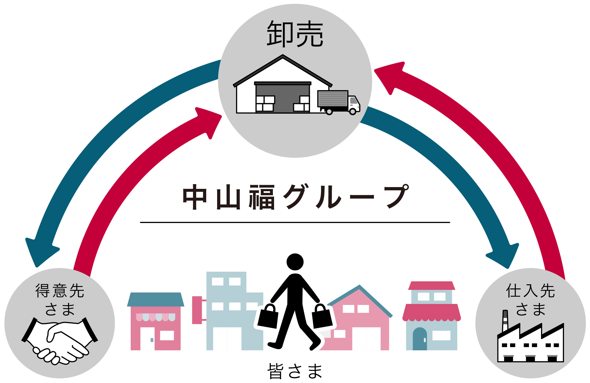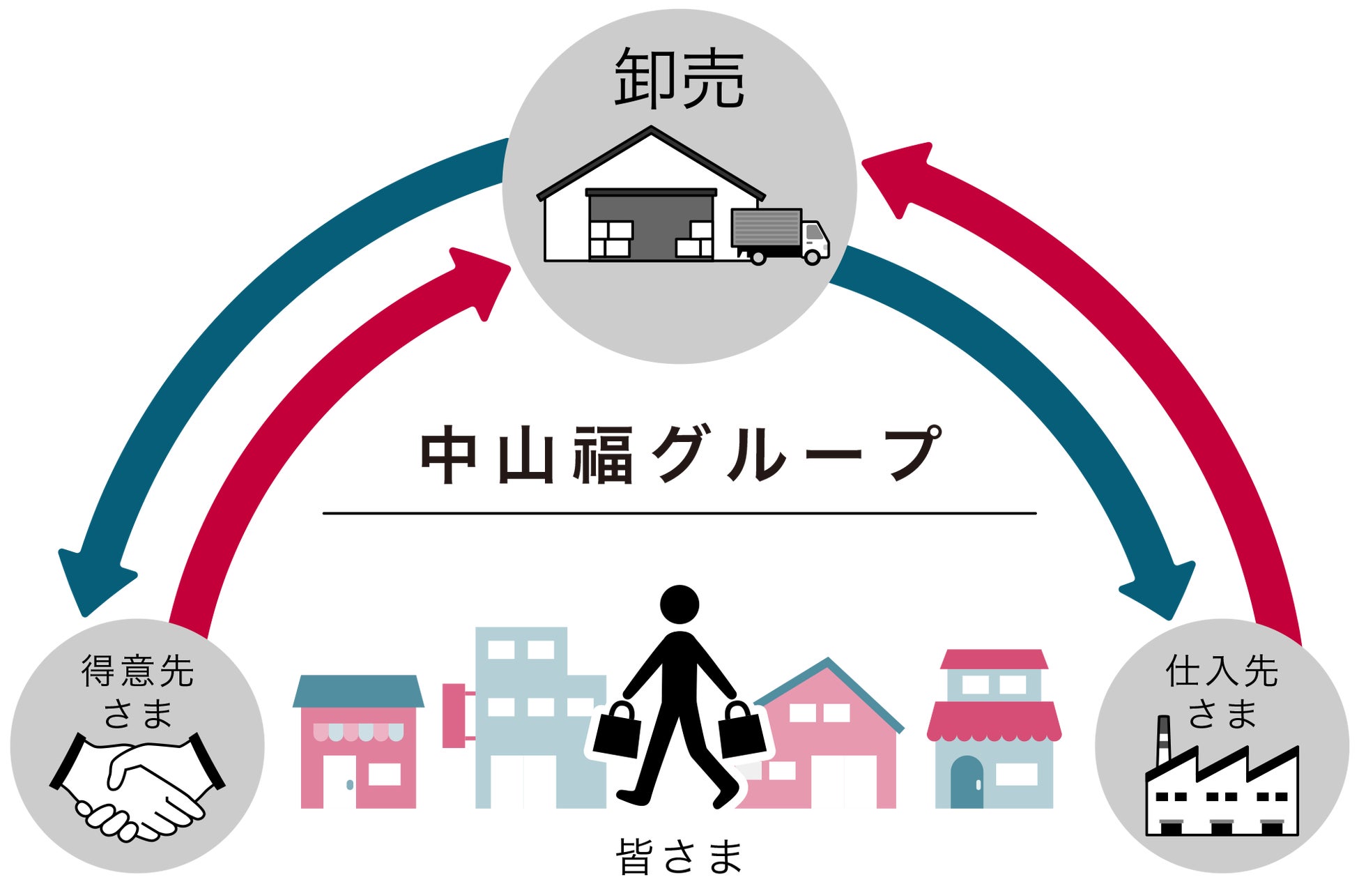 現在、当社グループは3つのグループ会社で構成され、流通の各段階をつなぎながら、生活者の暮らしを支える価値を届けてきました。
