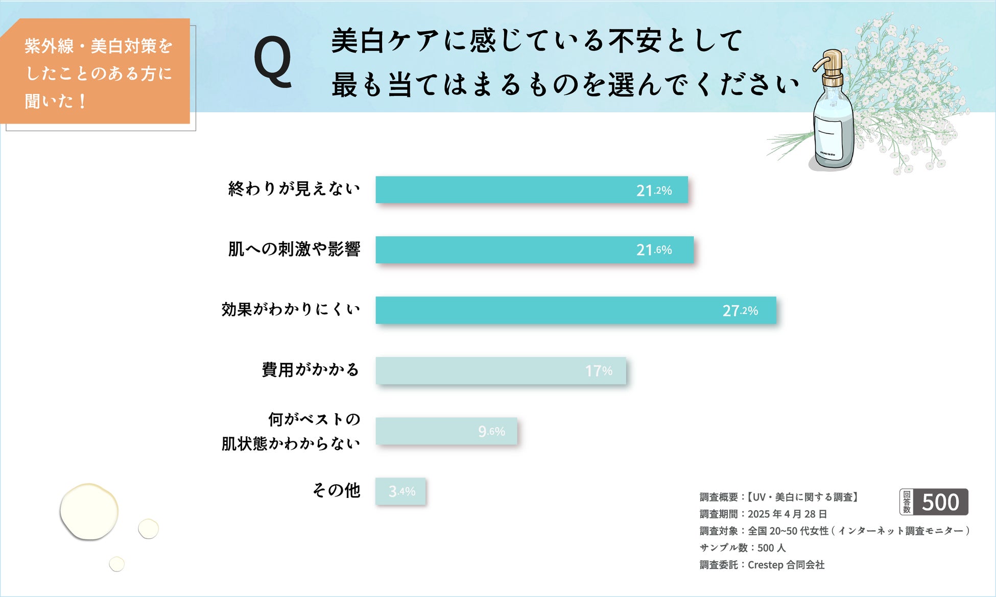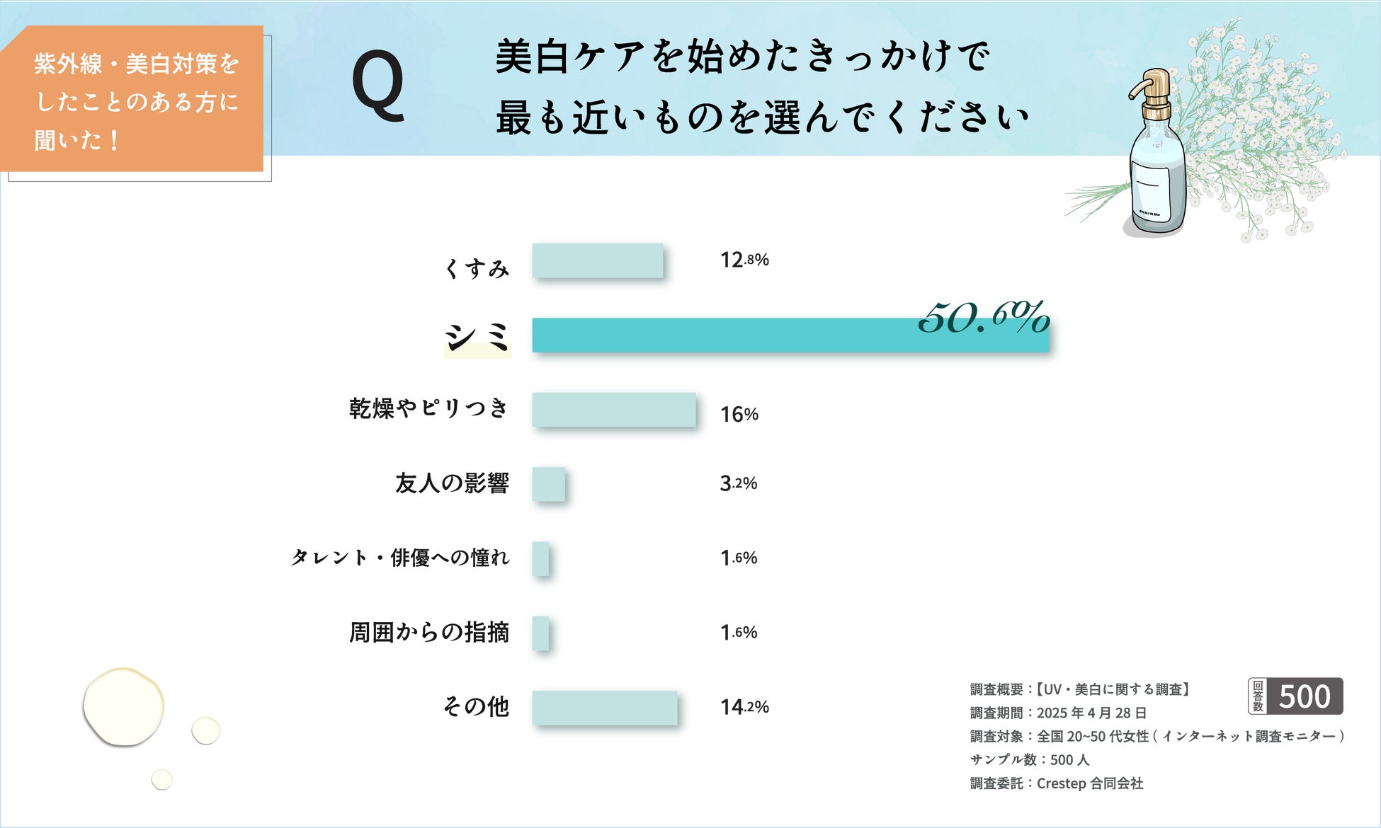 美白のきっかけは「シミ」、効果実感は約5割。不安や商品選びのポイントも明らかに