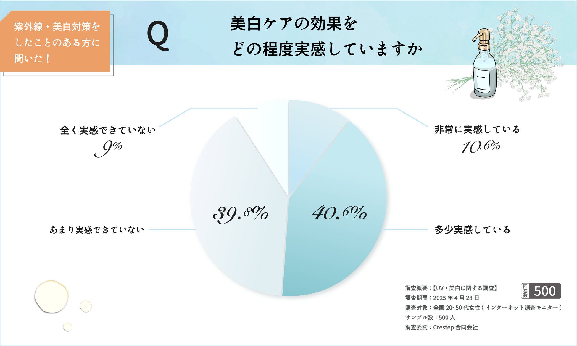 株式会社ミンフォ(本社:韓国ソウル市江南区、代表:永田丈也)は、全国の20〜50代女性を対象に「UV・美白に関する意識調査(第2弾)」を実施いたしました。本調査では、紫外線・美白対策を行った経験のある女性500名を対象に、美白ケアを始めたきっかけや効果の実感度、不安に感じていること、商品選びの際の重視点について尋ねました。