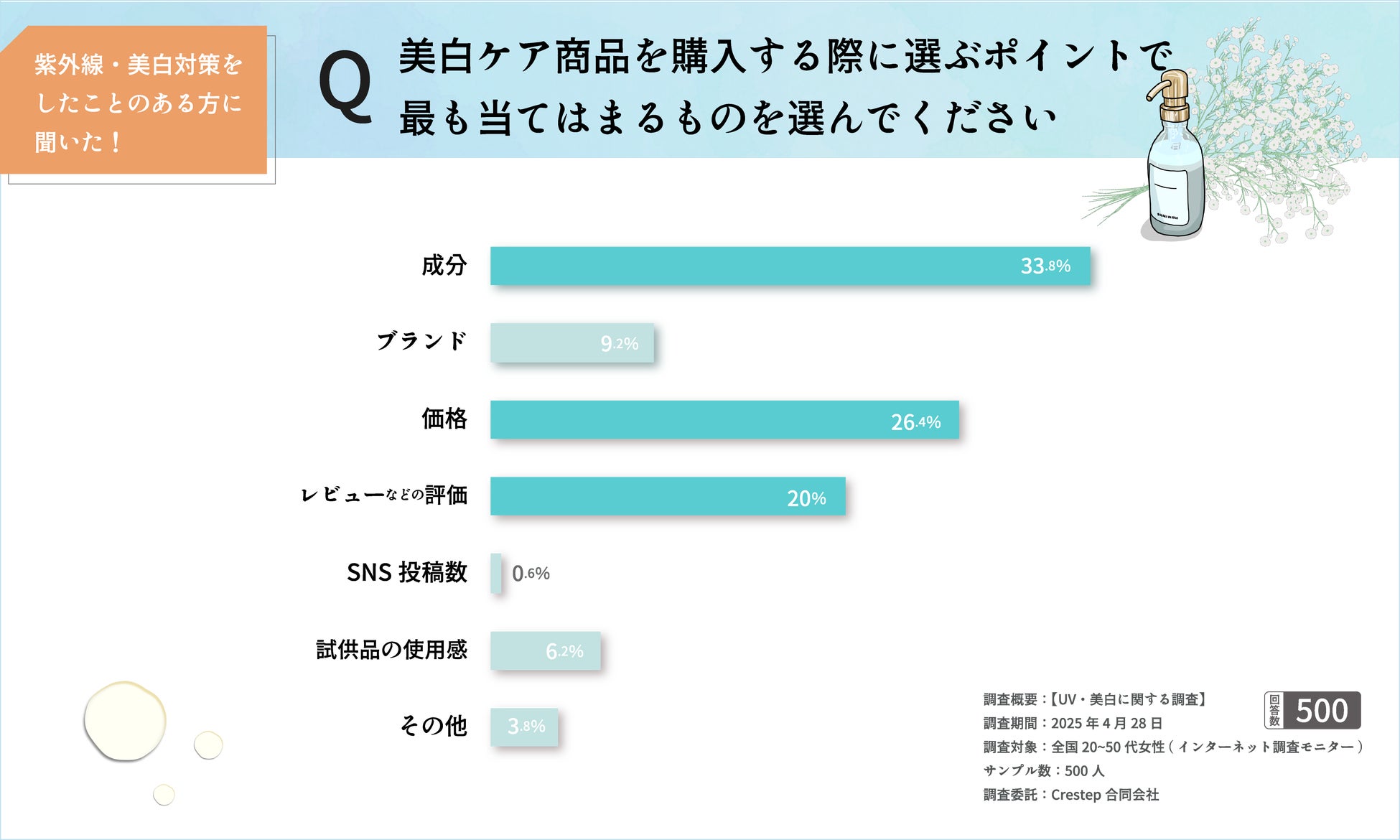 「美白ケア商品を購入する際に選ぶポイント」で最も多かったのは「効果が高そう」(33.8%)。次いで「成分が肌に合いそう」(26.4%)、「価格が手頃」(20%)と続き、効果と安全性、価格バランスが重視されていることがわかりました。