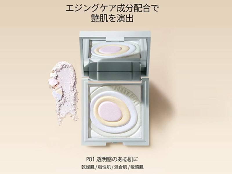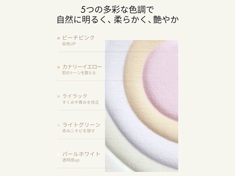 光を多方向に反射させるピグメントと先進の粉化技術を採用し、自然なツヤと均一な肌印象を演出※1。角質ケア成分や植物エキスを配合し、メイクアップ中も肌をしっとりと整えます。4色カラーをミックスし、肌のトーンを明るく見せます※1。