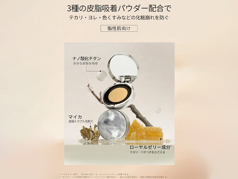 薄膜で密着する3D粒子と成膜技術で、汗や皮脂によるメイクくずれを抑え※1、高い化粧持ちを実現。空洞シリカによる超高吸油力でテカリを抑え、乾燥による粉浮きも防止。マスク摩擦にも負けない快適な使い心地と、マット〜セミマットのナチュラルなツヤ感を両立します。※1