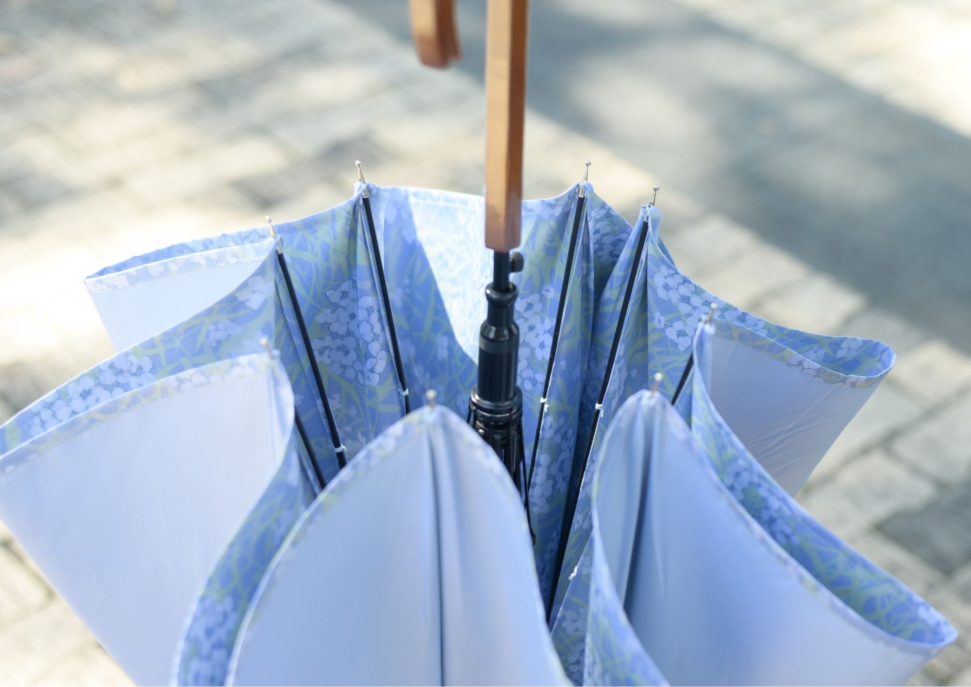 内側には、水彩画のフラワーデザインを採用。黒一色だった傘の内側に、見上げるたびに心がほどけるような和らぎと上品さを宿しました。