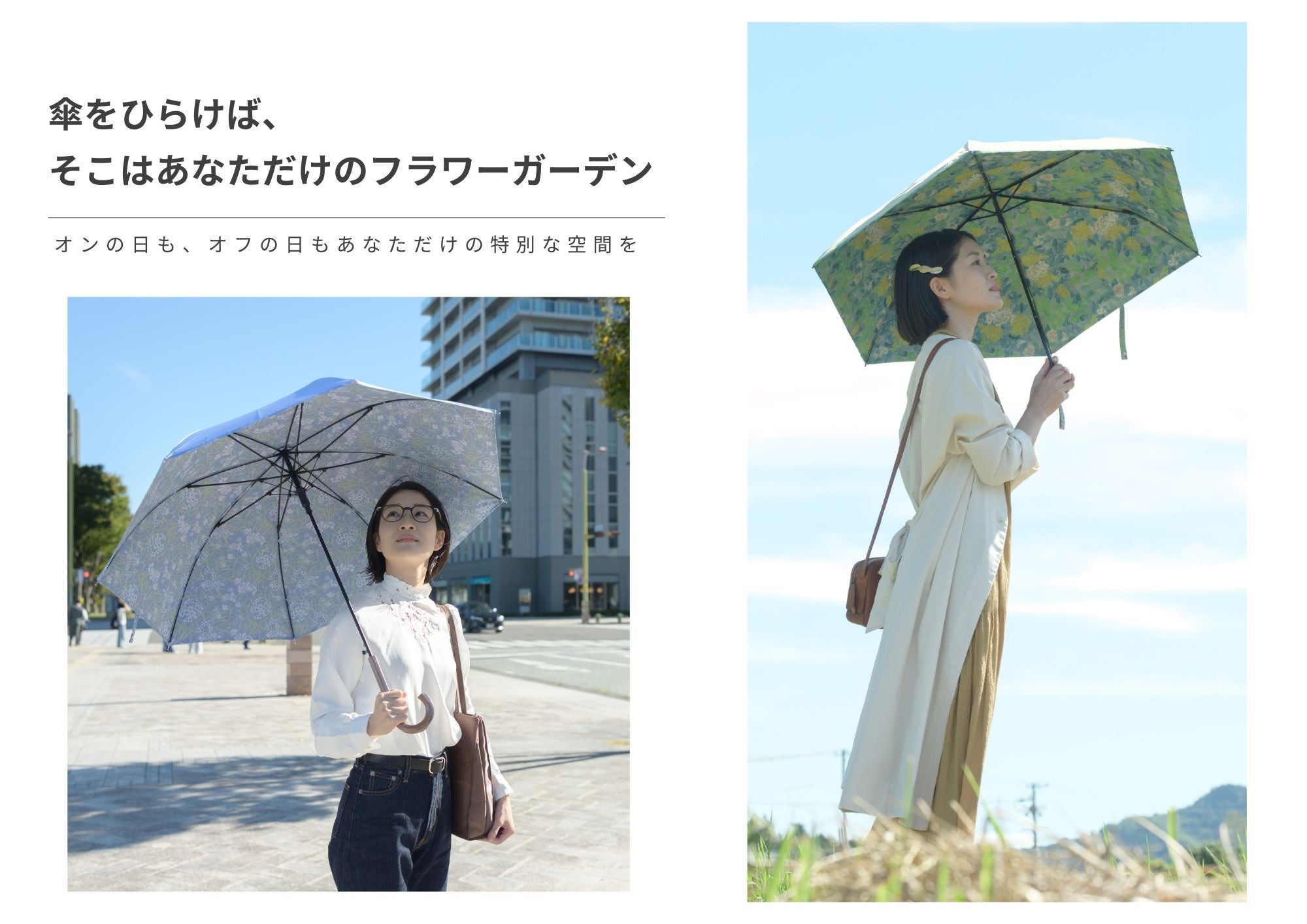 オンの日も、オフの日も。通勤の朝も、休日の散歩道でも。傘を開くたび、頭上にはあなただけの特別な空間が広がります。