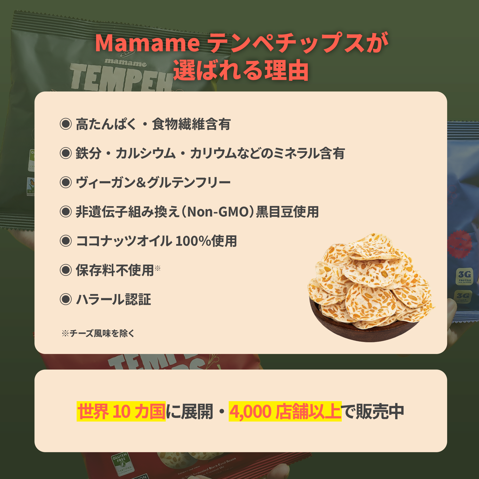 「Mamame テンペチップス」は、非遺伝子組み換え(Non-GMO)の黒目豆を使用した、ヴィーガン対応・グルテンフリーのヘルシースナックです。1袋(50g)あたり5gのたんぱく質と6gの食物繊維を含み、さらに鉄分やカルシウム、カリウムなどのミネラルも含まれています。保存料を使用せず(※1)に13カ月の保存が可能で、仕事や勉強の合間のおやつ、運動後のリフレッシュ、ワインのおつまみなど幅広いシーンでお楽しみいただけます。