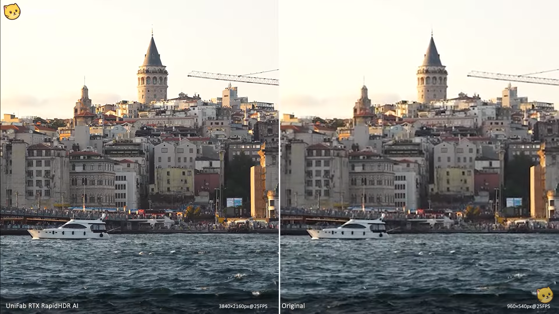 RTX RapidHDR AIはディープラーニングモデルを用いて動画コンテンツを分析し、映像内のぼけ、ノイズ、アーティファクトをインテリジェントに識別・修復します。同時に動画の超解像度拡大をサポートし、低解像度動画でも高精細、さらにはそれ以上の規格のディスプレイで鮮明かつシャープな画質を実現します。
