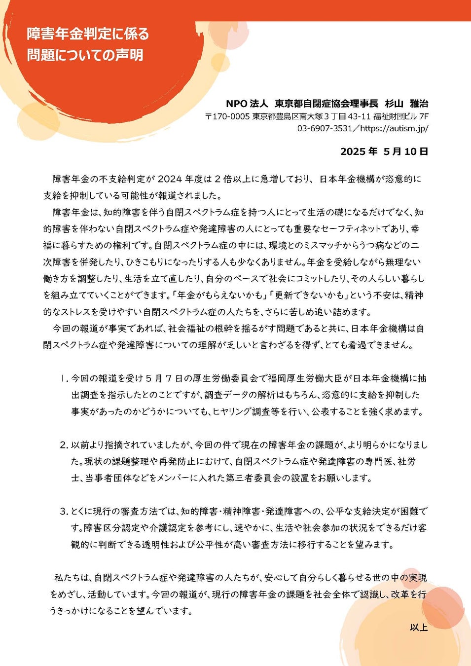 NPO法人 東京都自閉症協会(理事長:杉山 雅治)は、「障害年金の不支給判定が2024年度は2倍以上に急増している」との報道を受けて、緊急声明を発表しました。