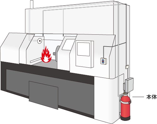 本製品は、工作機械や製造装置を火災から守るための自動消火装置です。防護対象物の温度上昇を温度センサ(サーミスタセンサ)で検知し、取り付けられた放射ノズルから消火薬剤を自動で放出します。手動操作による起動も可能で、確実な防火対策により製造現場の安全を支えます。