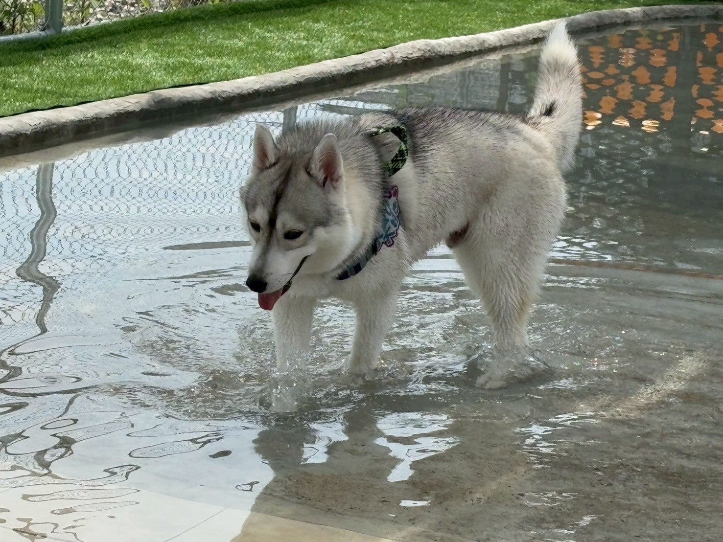 リニューアルした人工芝のプールサイドで、愛犬と快適な水遊びを
