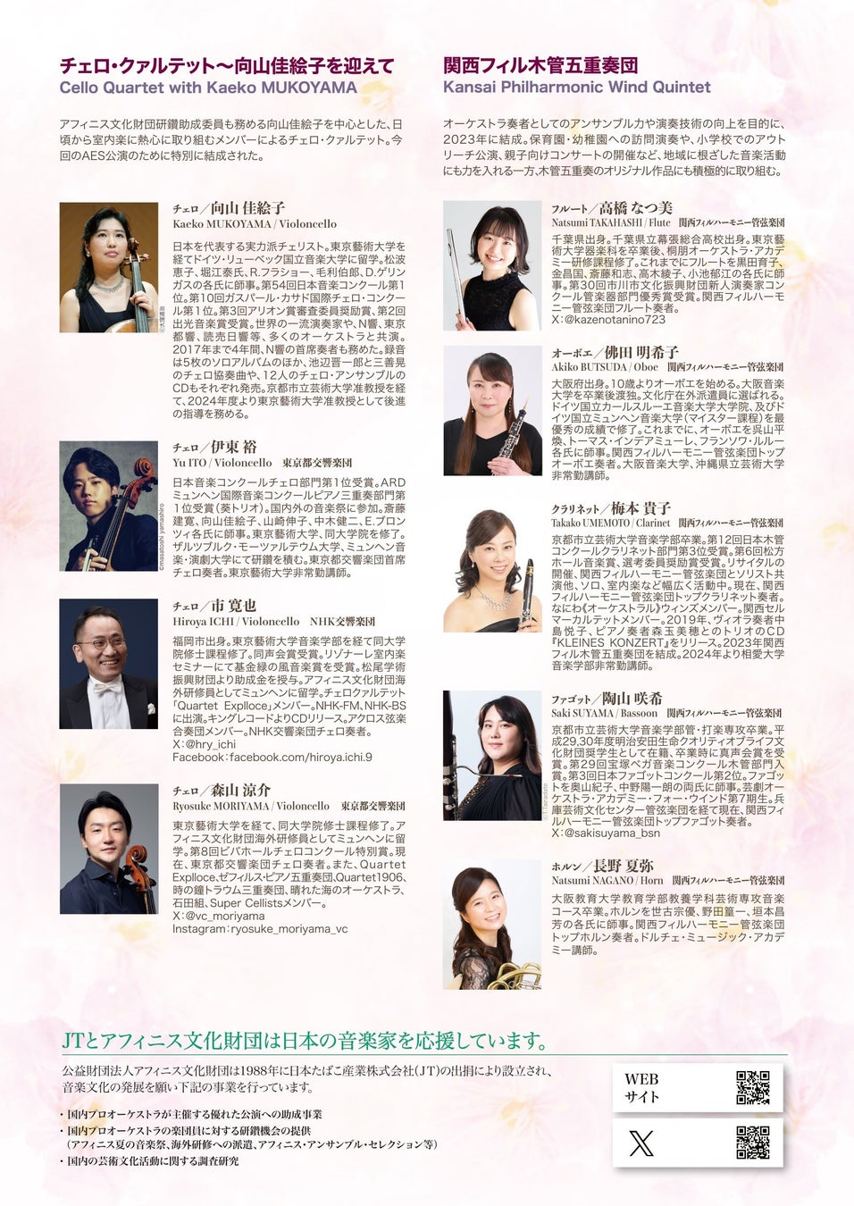 公益財団法人アフィニス文化財団は、日本のプロオーケストラに所属する楽団員の積極的な室内楽への取り組みを応援しています。この度、当財団主催公演「アフィニス アンサンブル セレクション(AES) 2025」におきまして、関西フィルハーモニー管弦楽団のメンバーによって結成された《関西フィル木管五重奏団》と、日本を代表するチェロ奏者・向山佳絵子を中心に4名のチェリストで構成された《チェロ・クァルテット〜向山佳絵子を迎えて》の2団体による演奏をお届けします。弦楽器と管楽器、それぞれの魅力あふれるアンサンブルをお楽しみください。