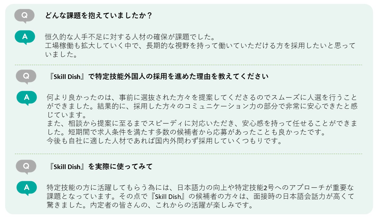 「多数の日本語力が高い候補者から、水産加工で働きたい人材を採用できました」