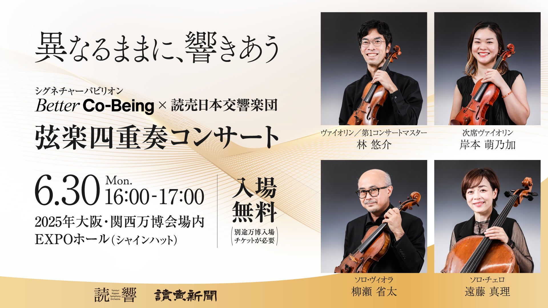 6月30日(月)に、大阪・関西万博会場内EXPOホール「シャインハット」で読売日本交響楽団の奏者による弦楽四重奏「異なるままに、響きあう シグネチャーパビリオンBetter Co-Being×読売日本交響楽団 弦楽四重奏コンサート」を開催します。