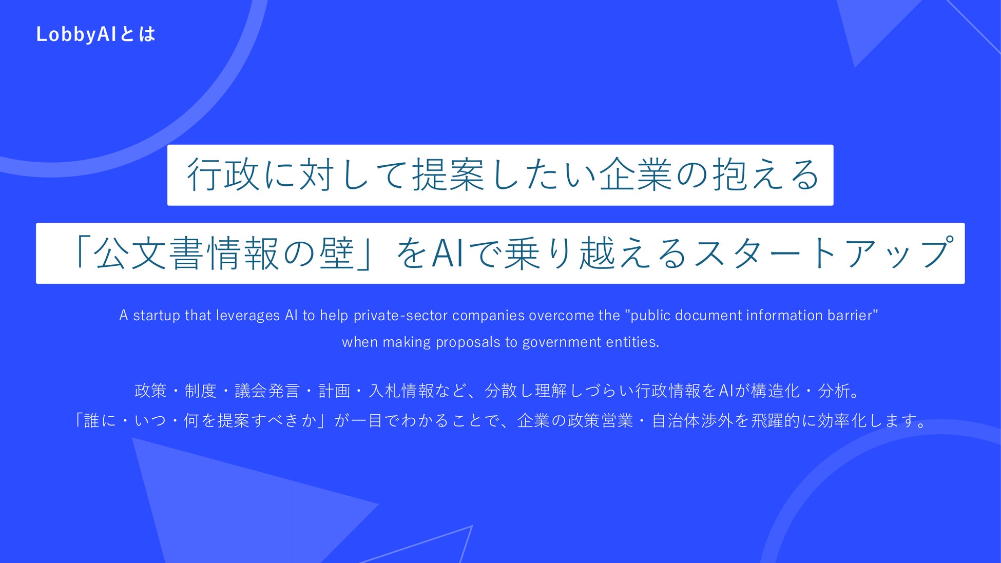 LobbyAI株式会社は「政策を、誰もが使いこなせる時代へ」をビジョンに掲げるスタートアップです。