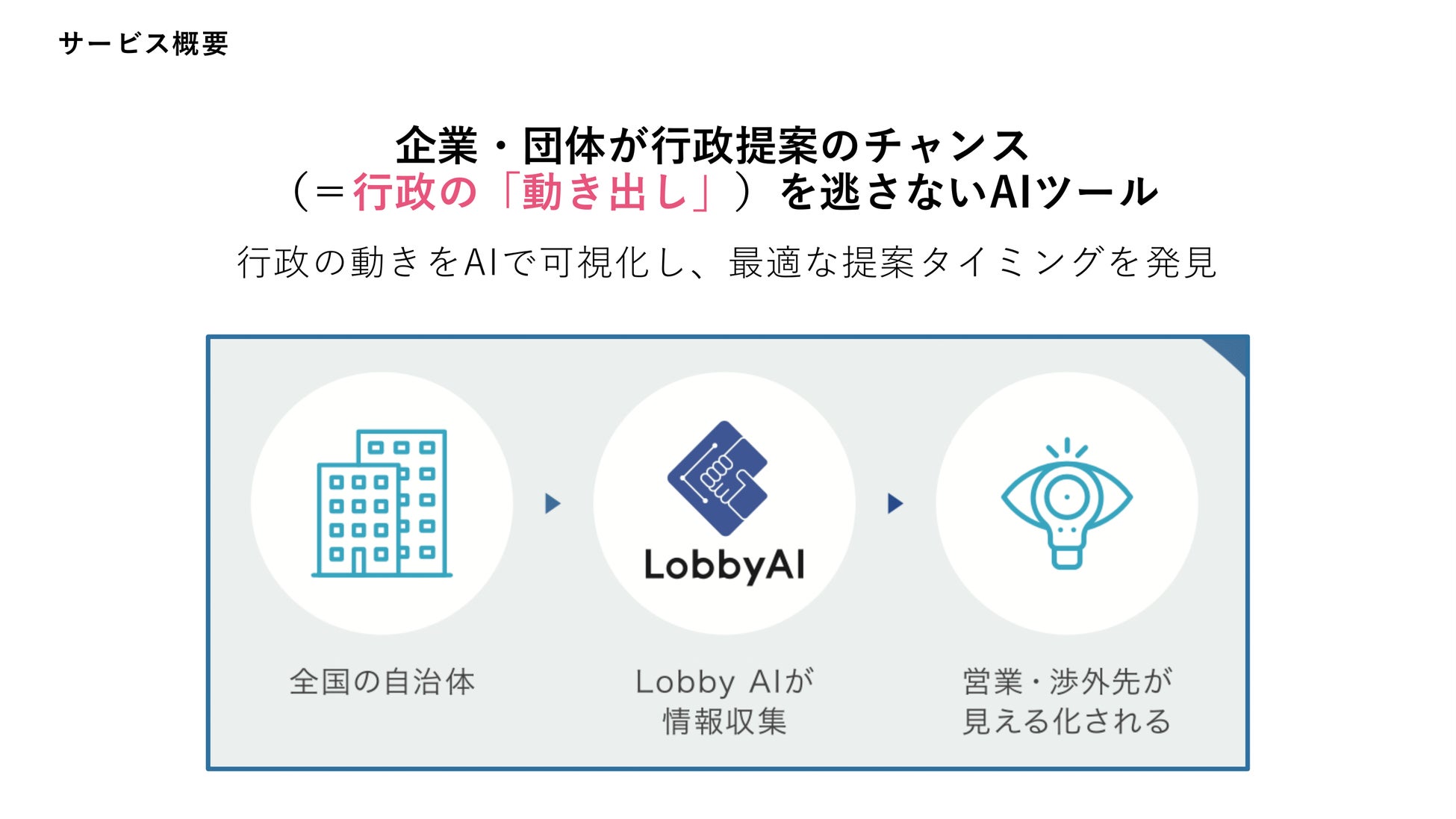 当社が開発・提供する「Lobby Local」は、自治体の議事録、予算、計画書、入札情報といった膨大な公開情報をAIで解析し、企業が「今、どの自治体に、どのような提案をすべきか」という問いに対して、最適なタイミングとアプローチ先をリアルタイムで提供するSaaSプロダクトです。