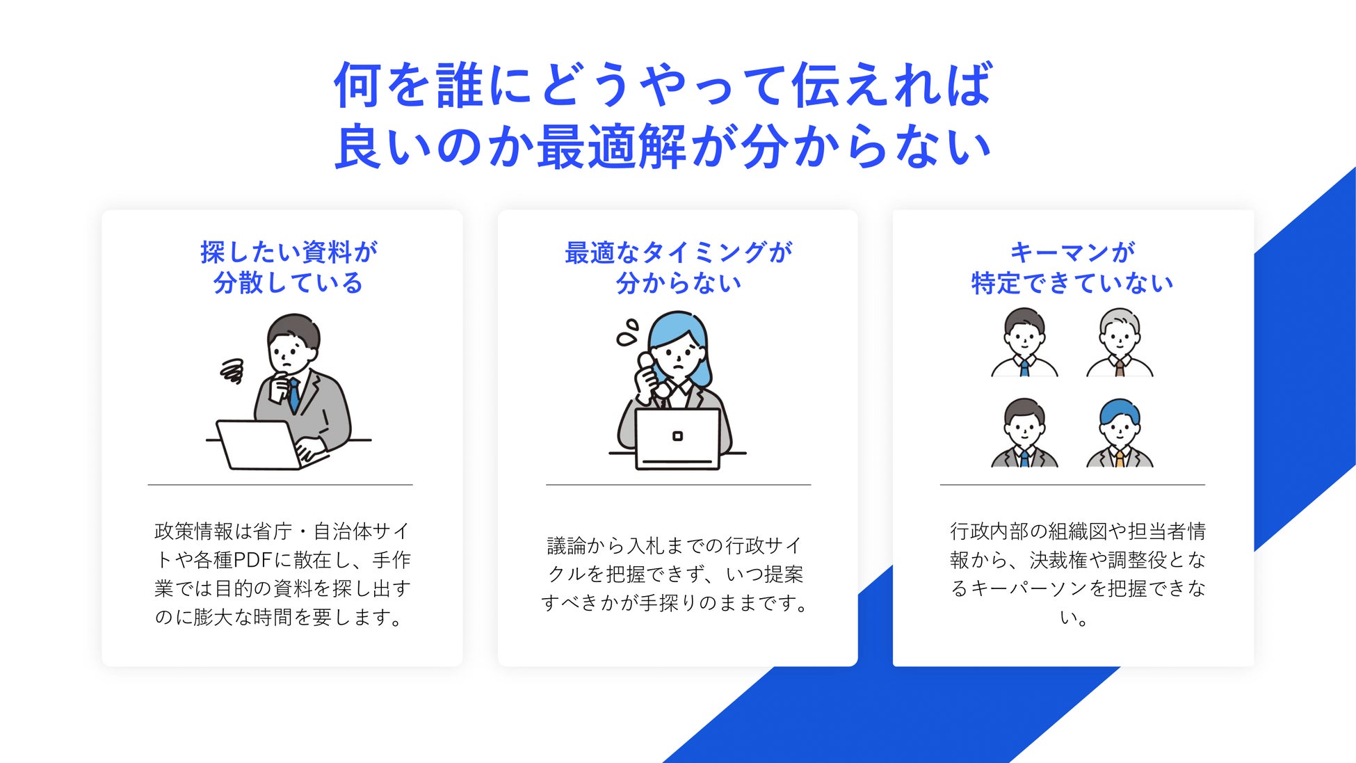 といった情報の非対称性が大きな参入障壁となり、多くの企業にとって、自治体へのアプローチは多大な時間とコストを要する非効率な領域であり続けました。
