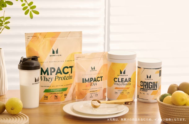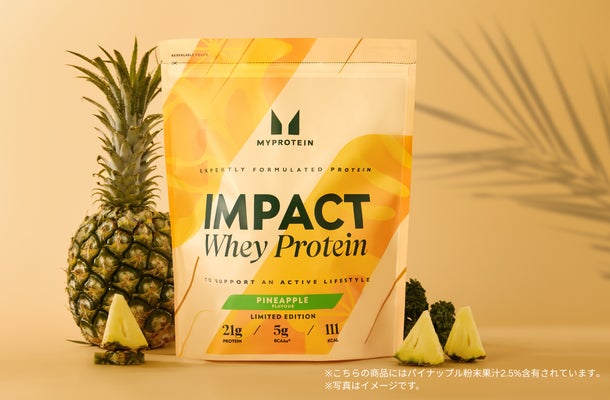 40種類以上のフレーバーを展開する人気商品「Impact ホエイ プロテイン」に、数量限定の<パイナップルフレーバー>が新登場。パイナップルジュースのような爽やかな味わいで、プロテイン初心者にも親しみやすく、マイプロテイン社員からも好評の自信作です。1食(30g)あたりに21gのたんぱく質と5gの原料由来のBCAAを配合し、トレーニング後の栄養補給にもおすすめです。