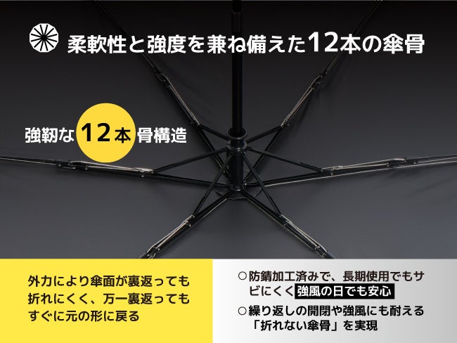 しなやかで折れにくい12本骨の構造が、強風や激しい雨の日でもしっかりガード。耐久性に優れ、風で裏返ってしまってもワンタッチで元に戻ります。長く使える安心設計です。