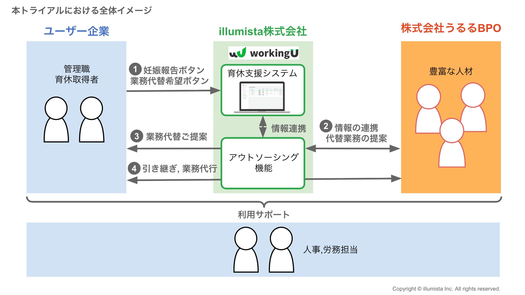 illumista株式会社(本社:東京都世田谷区、代表取締役CEO:富樫 憲之、読み:イルミスタ、以下 illumista)は、日本で初めて(※1)法人向け育休支援システム「workingU」と連動した新機能として、産休・育休による企業の人材不足問題を解決するアウトソーシングの実証トライアルを2025年10月28日(火)より開始し、実証トライアル企業を募集開始いたします。