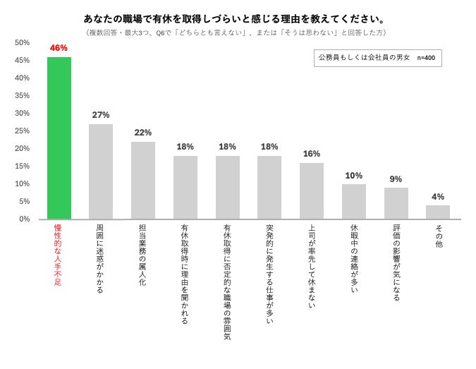 【従業員視点】育休取得における阻害要因第1位は「慢性的な人手不足(46%)」と回答。