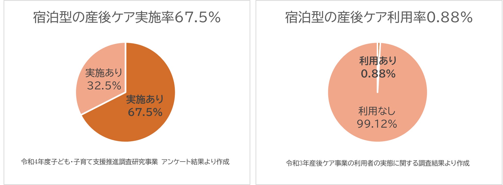 近隣アジア諸国の韓国や台湾では産後ケアサービスが社会的に浸透しており、韓国では85.5%(※1)、台湾では62.46%(※2)の母親が利用しています。一方で、日本では、宿泊型の産後ケア事業を実施する自治体は令和4年度には約67.5%と徐々に増えているものの、空床がないことや人手不足を理由に利用を断られるケースもあり、利用率は日本の年間出生数の0.88%にとどまり、日本の利用率の低さは際立っています。