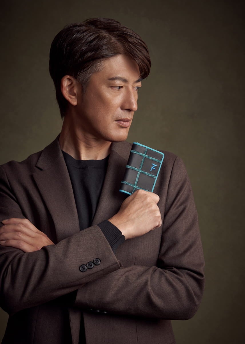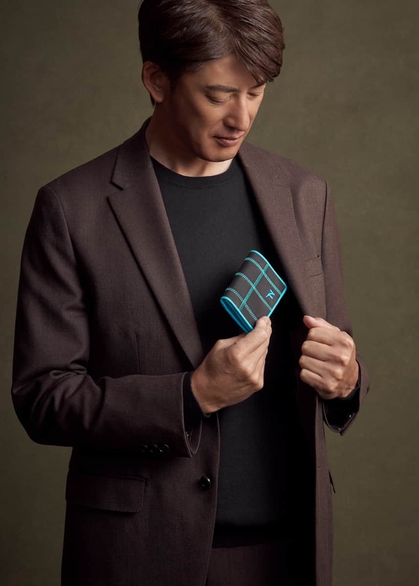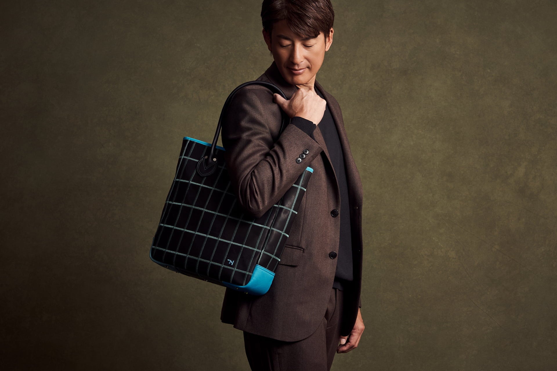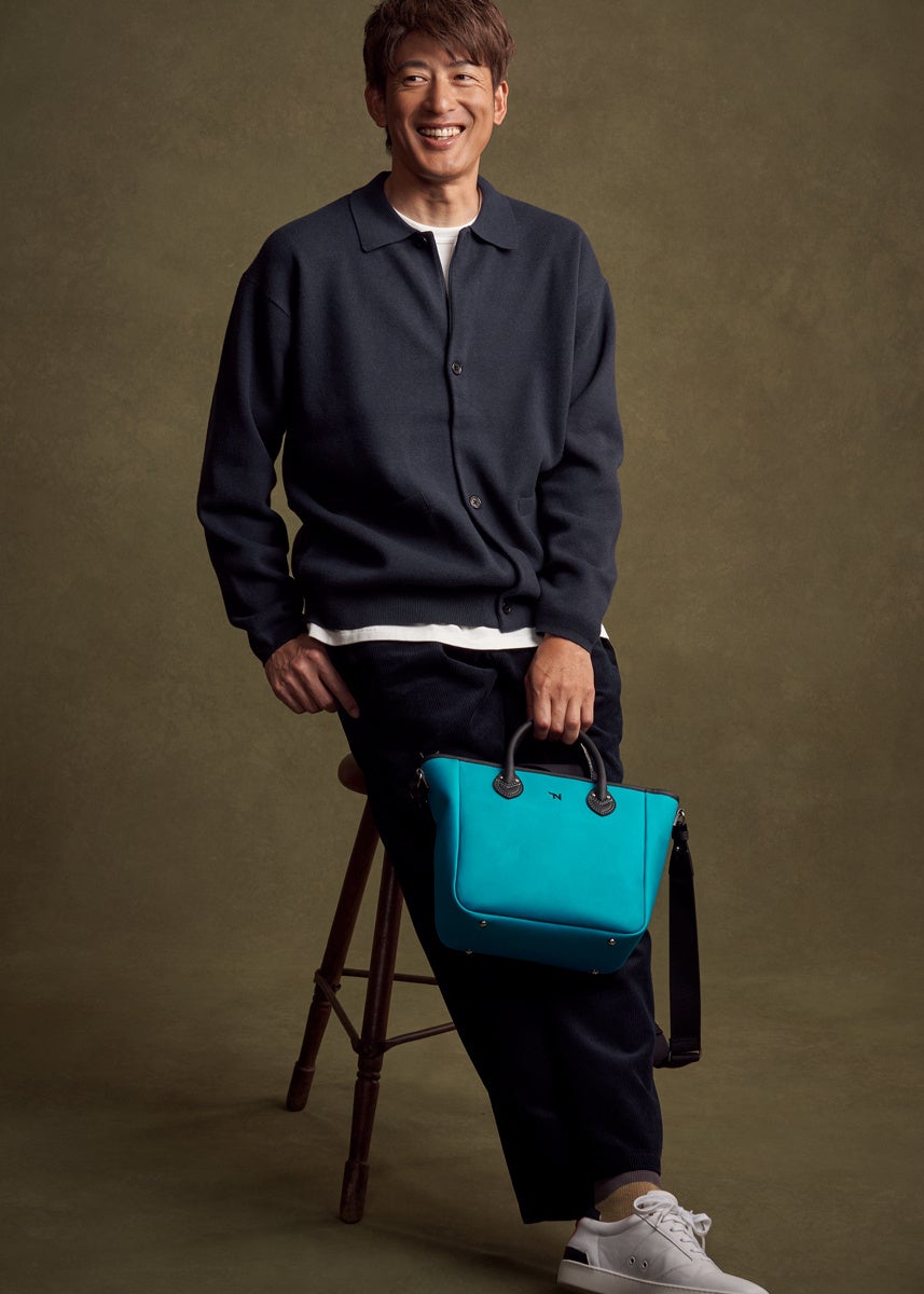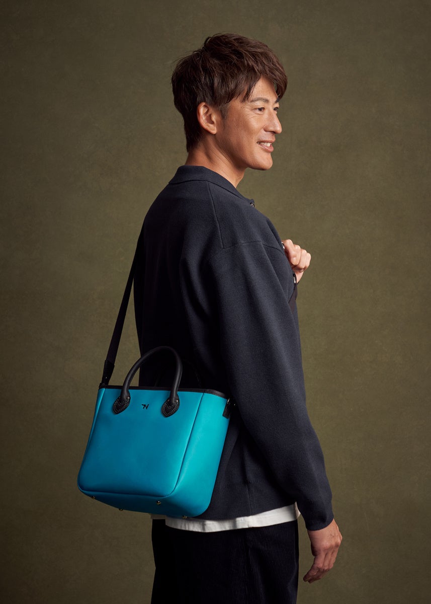 能見さんの手に長年なじんだ野球グローブの色をモチーフに、TRIONの人気「パネルトート」に新たな表情を纏わせました。大胆でありながら繊細なブルーのアクセントが、ブラックのボディに知的な躍動感を与えています。