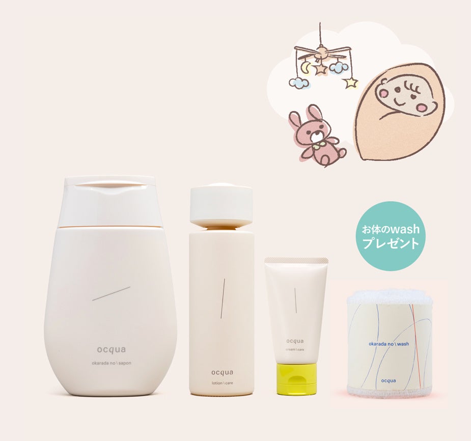 今回「Hello Baby セット」に選んだのは、天然成分100%のocquaシリーズの中でも最もやさしい、お肌の抵抗力の弱い赤ちゃんにも安心して使っていただけるラインナップです。