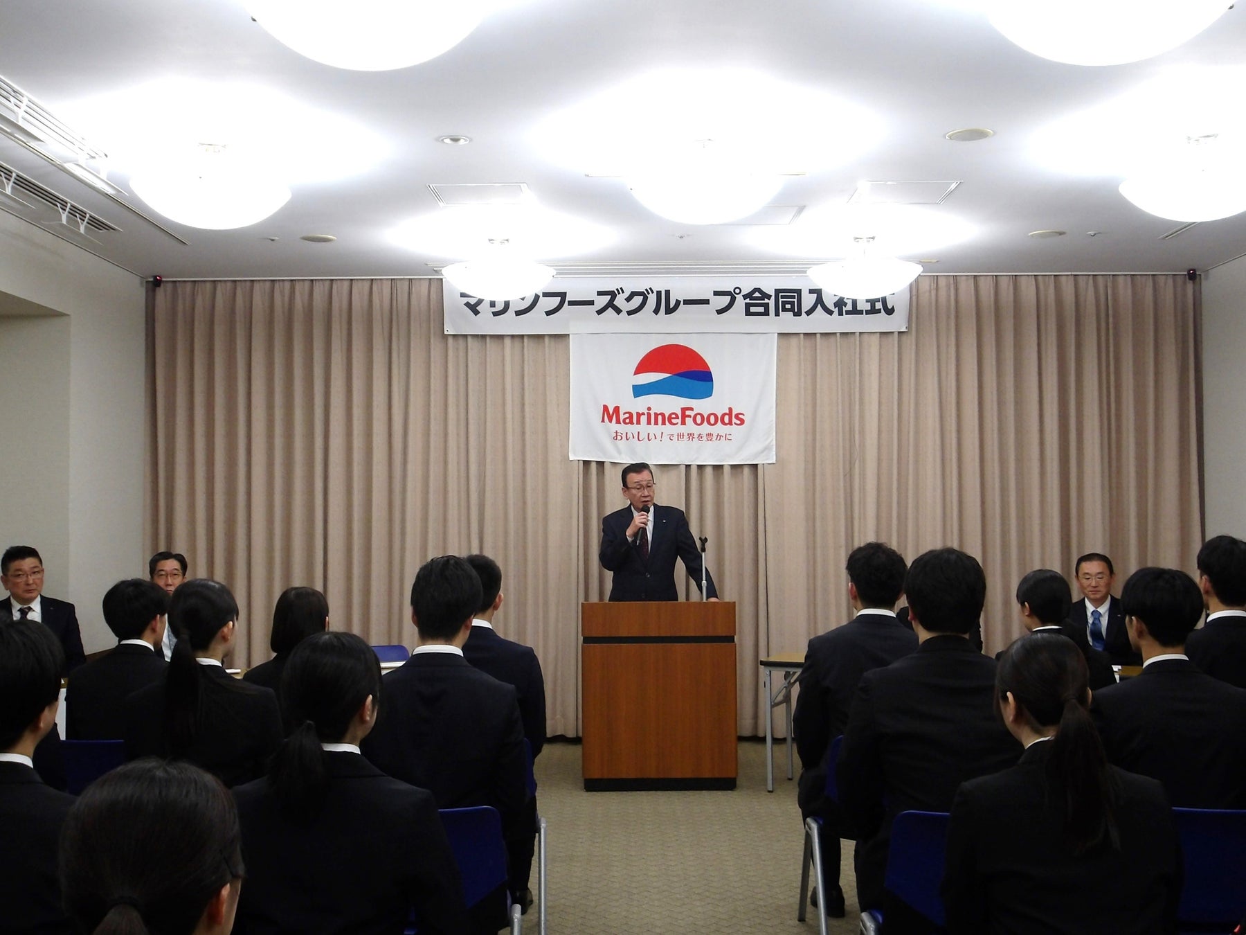 マリンフーズ株式会社(以下「マリンフーズ」)は、2025年4月1日(火)に入社式、4月4日(金)に辞令交付式、4月1日(火)~4月4日(金)までの4日間、東京にて新入社員研修を実施しました。本年度は、全国から集まった意欲あふれる新卒社員22名(男性13名、女性9名)を迎え、更なる成長と発展に向けた新たな一歩を踏み出しました。入社式では、社長より新入社員に対して、会社ビジョンや仕事をする上で大切にしてほしいことが伝えられ、その後、マリンフーズの各役員から新入社員への歓迎の言葉とともに激励のメッセージが贈られました。