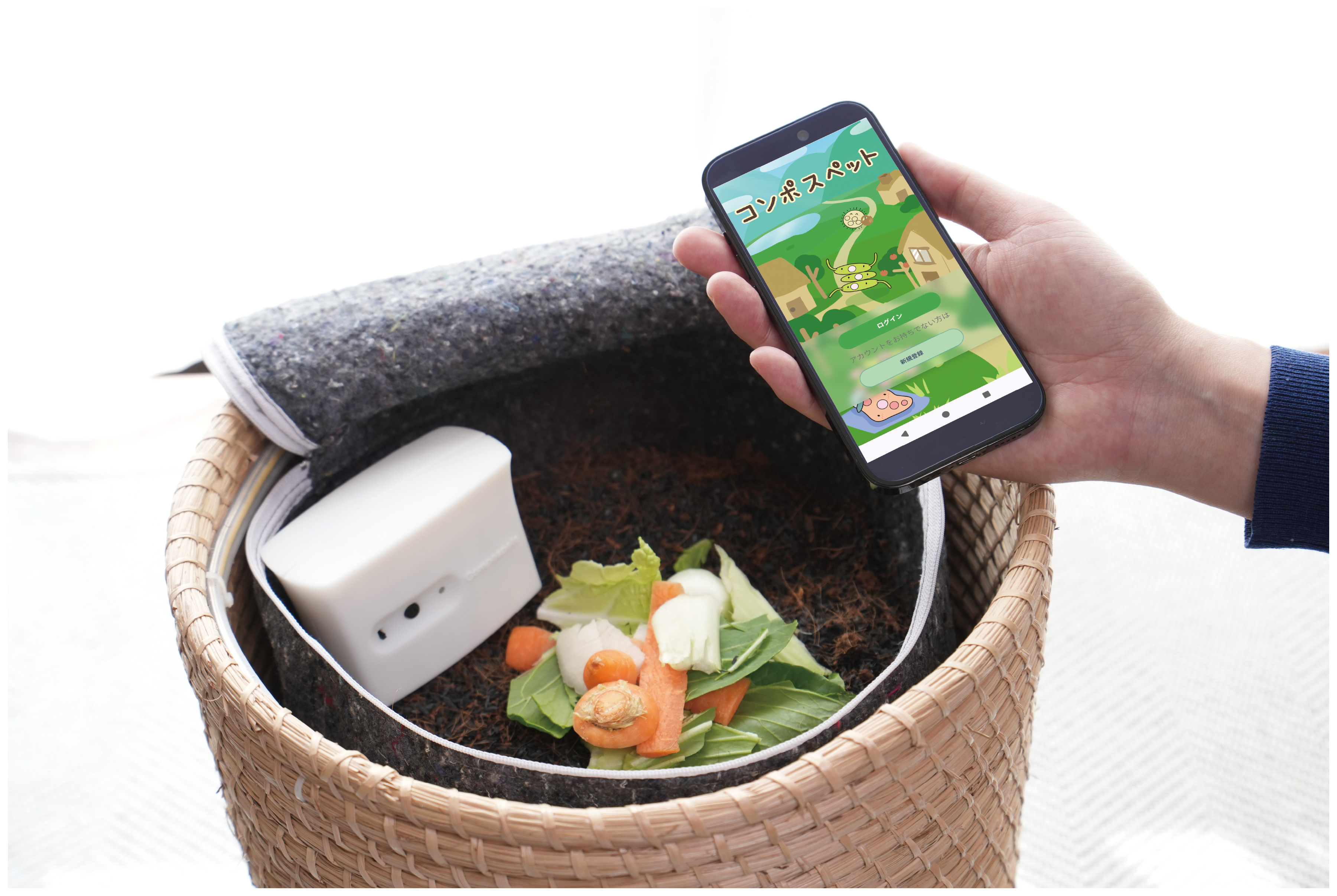 コンポストは基材と言われるベースの中に、生ごみを入れるだけで微生物が分解する、環境に良いものです。環境意識の高まりから、家庭向けのコンポストが広がりつつありますが、従来の家庭向けのコンポストは「やり方が分からない」「においや虫が心配」「状態の良し悪しが分からない」といった課題がありました。
