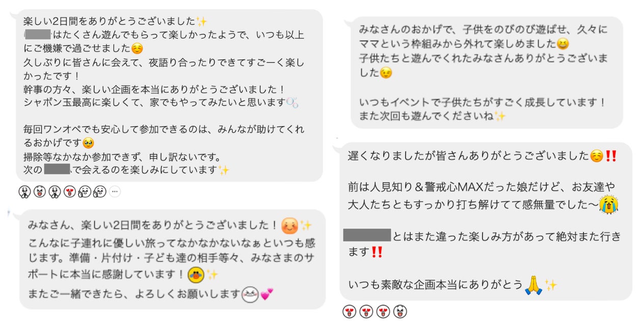 いずれかの保護者が一人で子どもを連れて参加する「ワンオペ参加」の方も多く、複数家族で支え合う仕組みにより「これまで一家庭では挑戦できなかった旅や体験が実現した」との声が多数寄せられています。