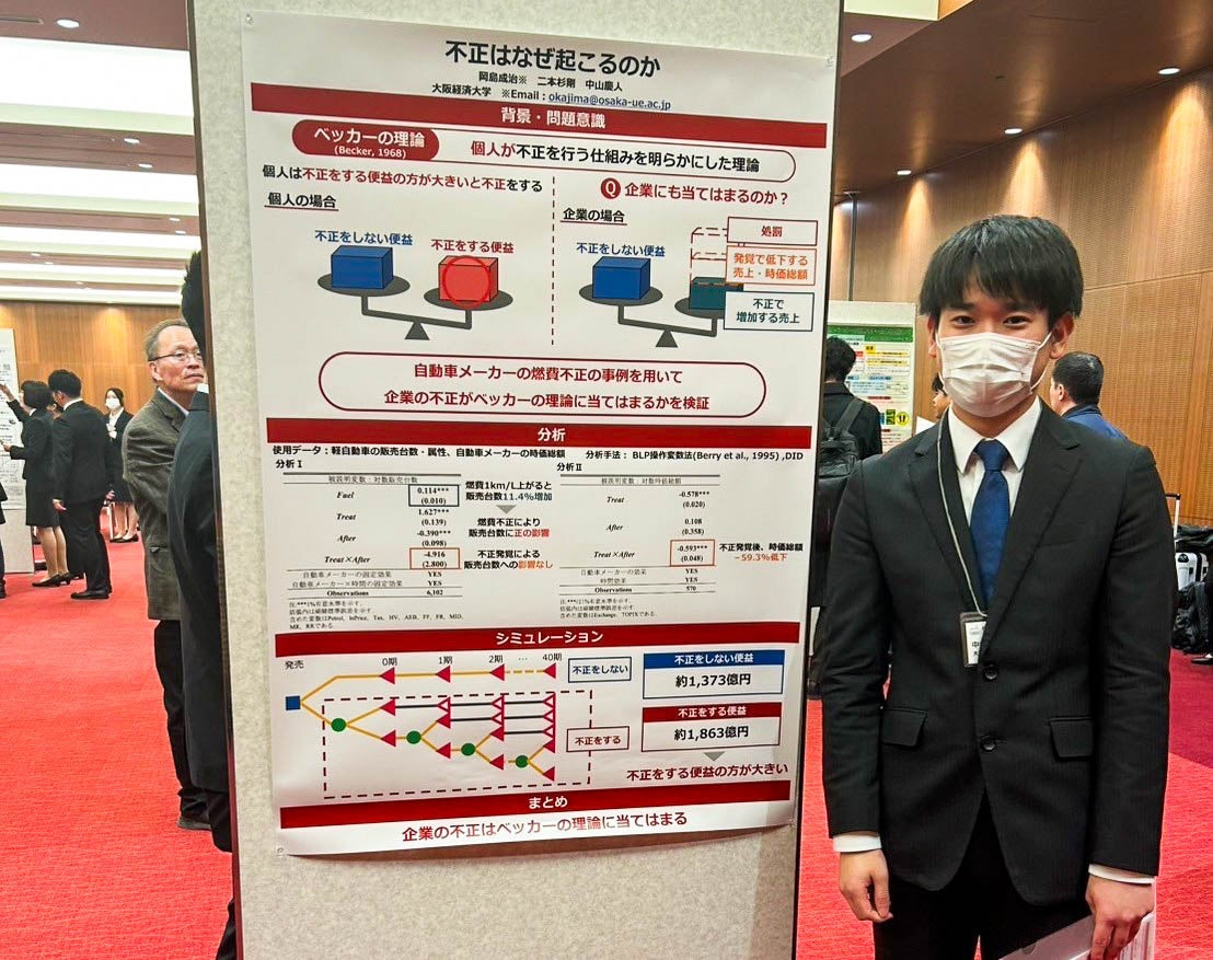 「不正はなぜ起こるのか」。このシンプルな問いを追い続けたのが、中山慶人さん(4年生)です。彼が行動経済学会第18回大会で奨励賞を受賞した研究は、自動車会社による燃費不正を例に、企業の不正行動を合理的選択理論の視点から分析したものです。