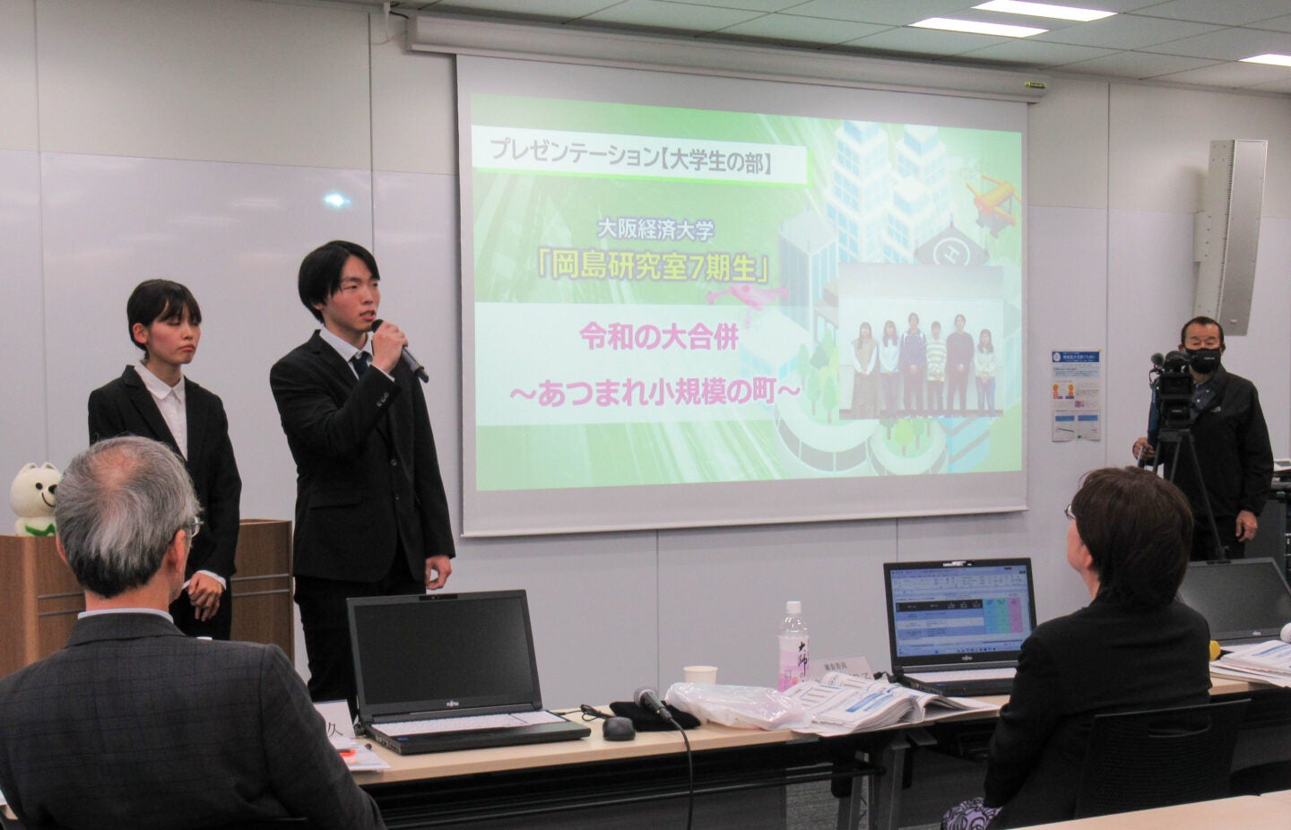 この大会は「2040年頃の理想のまち」をテーマに、全国の高校生・大学生から行政課題の解決策を募るもので、2人は角崎さんらの合併研究で蓄積されたデータを活用。小~中規模自治体の合併による歳出削減や行政効率の向上を、数値を用いて明示し、住民補助金などのインセンティブ提案も盛り込みました。