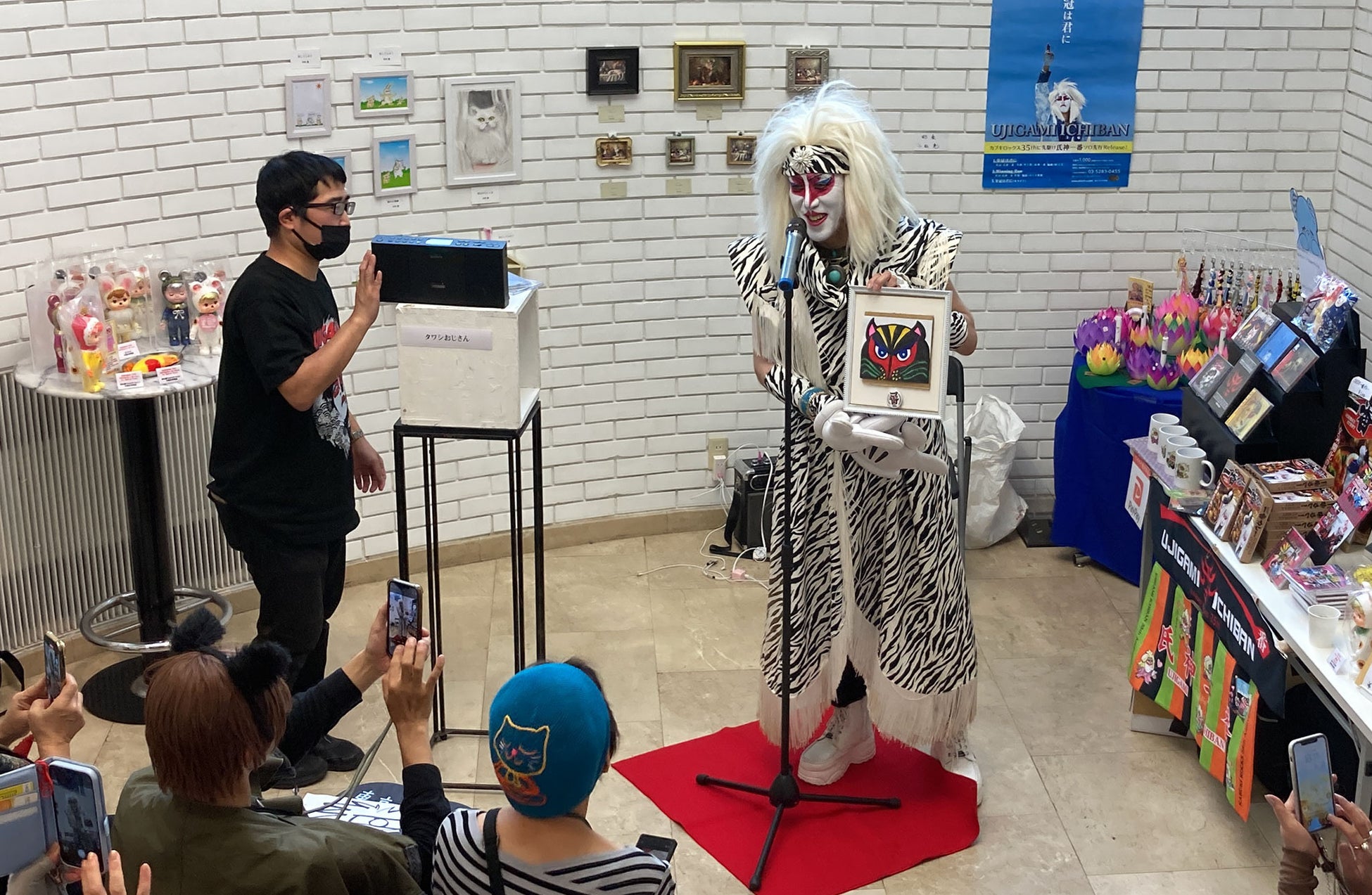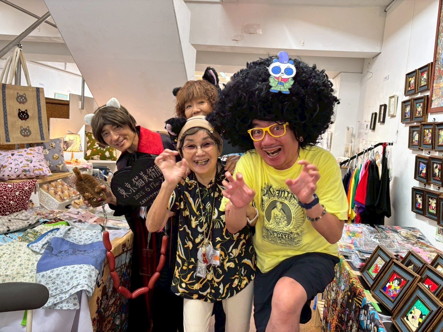 さらに特色づけたのは、氏神一番さん(ロック歌手)のライブと飼い猫トーク、大森英敏さん(ガンダムなどのアニメ美術監督)による猫キャラクターで町おこしの新企画発表、毎日登場した「たわしおじさん」の猫タワシパフォーマンス。「Gメン」の女優・藤田三保子さんの猫の出品作、昭和レトロなチャーミーちゃん人形やなめ猫、浅草新にゃか君なども展示され、話題を呼びました。