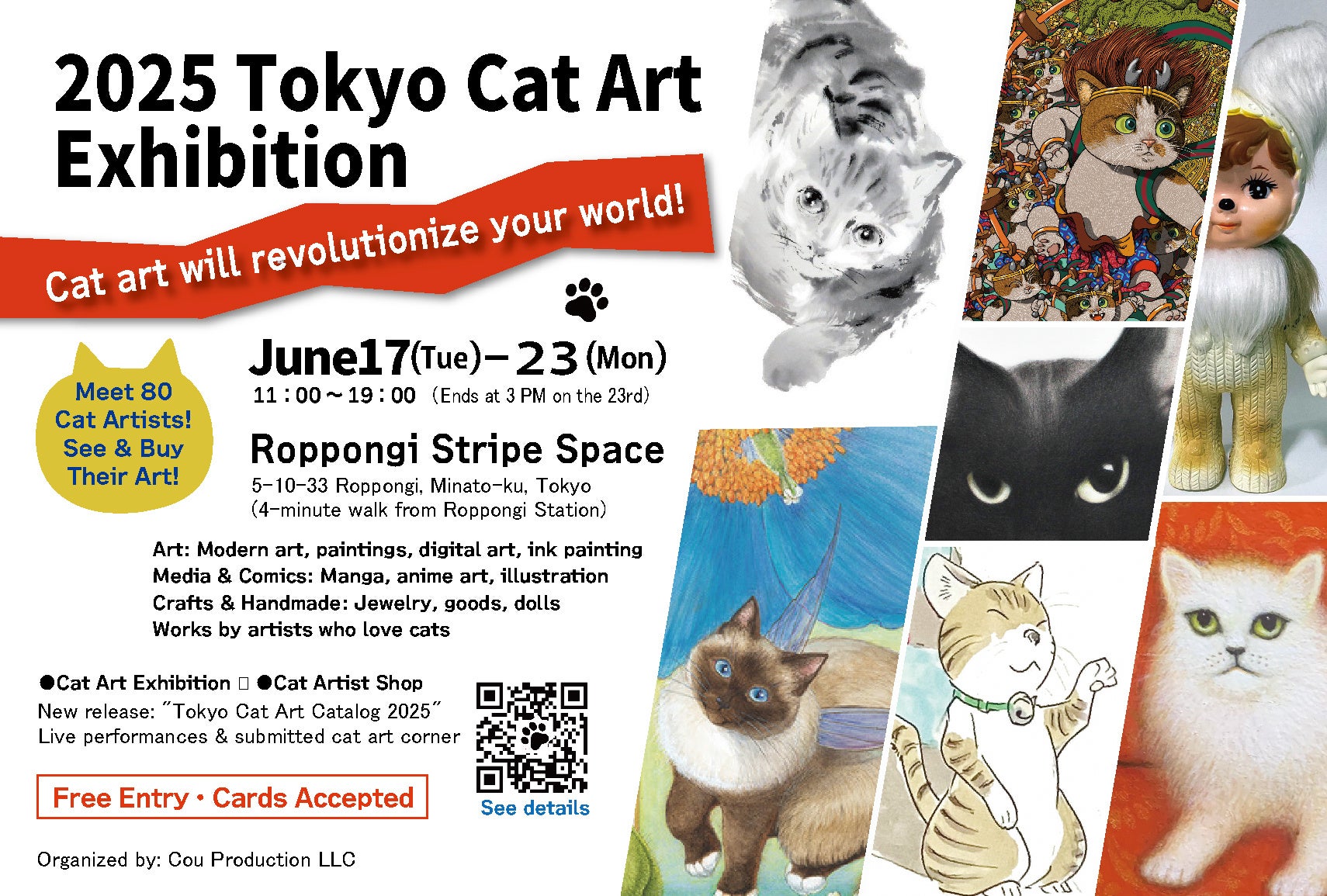 香プロダクション合同会社(東京都中央区、代表 鋤柄よし子)は、2025年6月17日〜23日に六本木ストライプスペースで開催した「東京猫美術展2025」を大盛況のうちに終了しました。次回は「猫の日イベント」の週(2026年2月20日〜25日)に「O美術館」(JR山手線大崎駅前)での開催が決定。全国各地でのコラボ美術展開催、医療施設へのアートレンタル、アートコンテンツ提供、コラボ商品企画、セミナー講師・アーティスト派遣、海外向けアート制作、広告出稿など、猫アートを活用した事業連携パートナーを広く募集します。