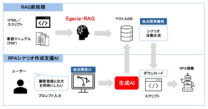 これらの課題を解決するために当社の「Egeria-RAG」を活用した独自のシステムを開発し、RPAシナリオを自動生成・実行してその精度を検証し、新規シナリオ作成業務の効率化に取り組みました。