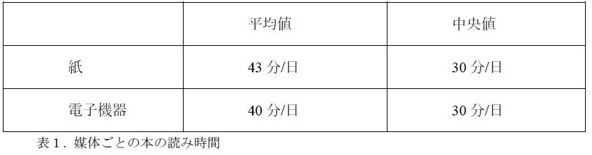 全回答者のうち紙で本を読むことがある人の割合は74%、電子機器で本を読むことがある人の割合は59%だった。本を読むことがあると答えた人の読み時間は(表1)の通り。