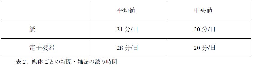 全回答者のうち紙で新聞・雑誌を読むことがある人の割合は30%、電子機器で新聞・雑誌を読む人の割合は38%であった。新聞・雑誌を読むことがあると答えた人の読み時間は(表2)の通り。