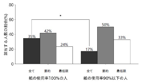 紙の使用率100%の人では「全て」の割合が「最低限」より高く、使用率90%以下の人では逆に「全て」の方が低い(図3)。電子機器を使う人は、最低限の記録にとどめる傾向が強いことがわかった。