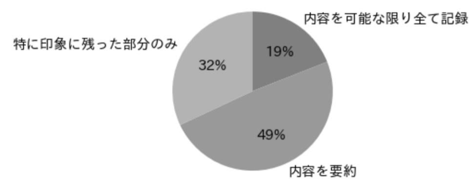 講義内容を記録すると答えた人に関して、その記録スタイルをさらに調べた結果(図1)、講義内容を記録する学生でも3割超が必要最低限の記録スタイルであることがわかった。
