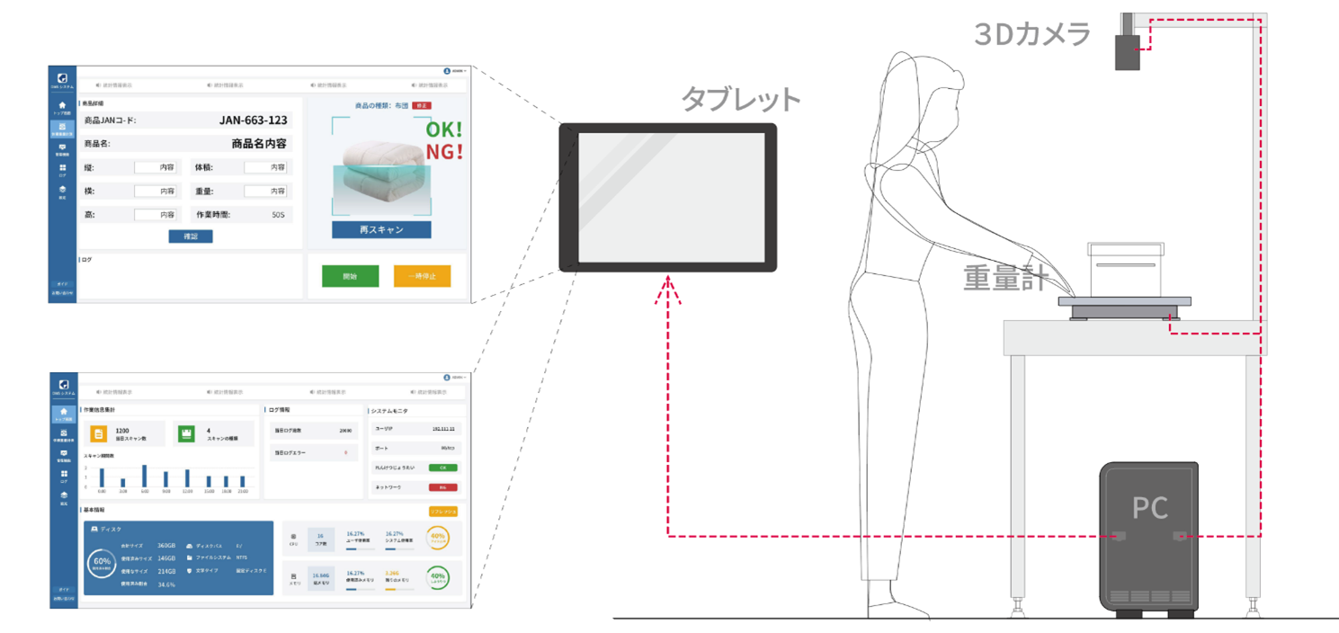 従来のDWSソリューションは作業台に設備が付属した形の高額な専用ラインとして設計されているものがほとんどでした。本製品は「3Dカメラ+重量計+PC+タブレット+(既存の)検品台」というシンプルな構成で、現場にとって必要十分な機能を低コストかつ迅速に導入することができます。